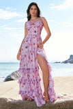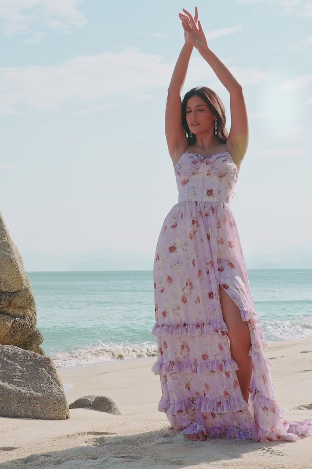 This flowy piece features a sweetheart neckline with delicate ruffle trim and spaghetti straps for a flirty, feminine feel. The tiered ruffles and soft slit add playful movement, while the pastel floral print makes it perfect for beach getaways, garden parties, or daytime weddings.