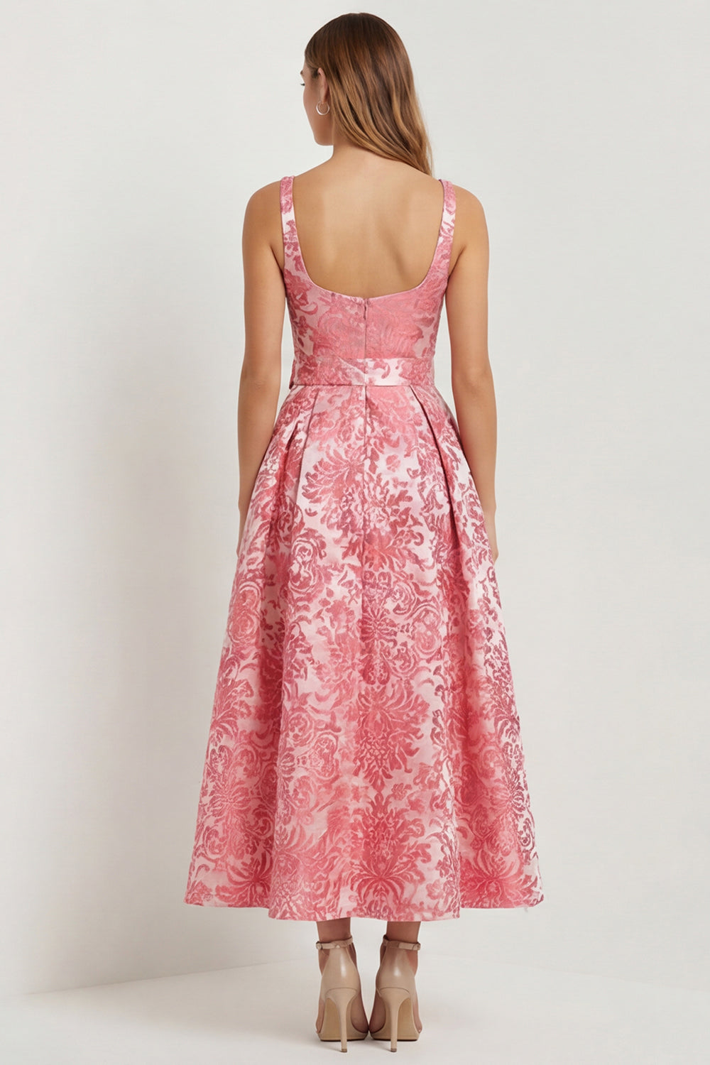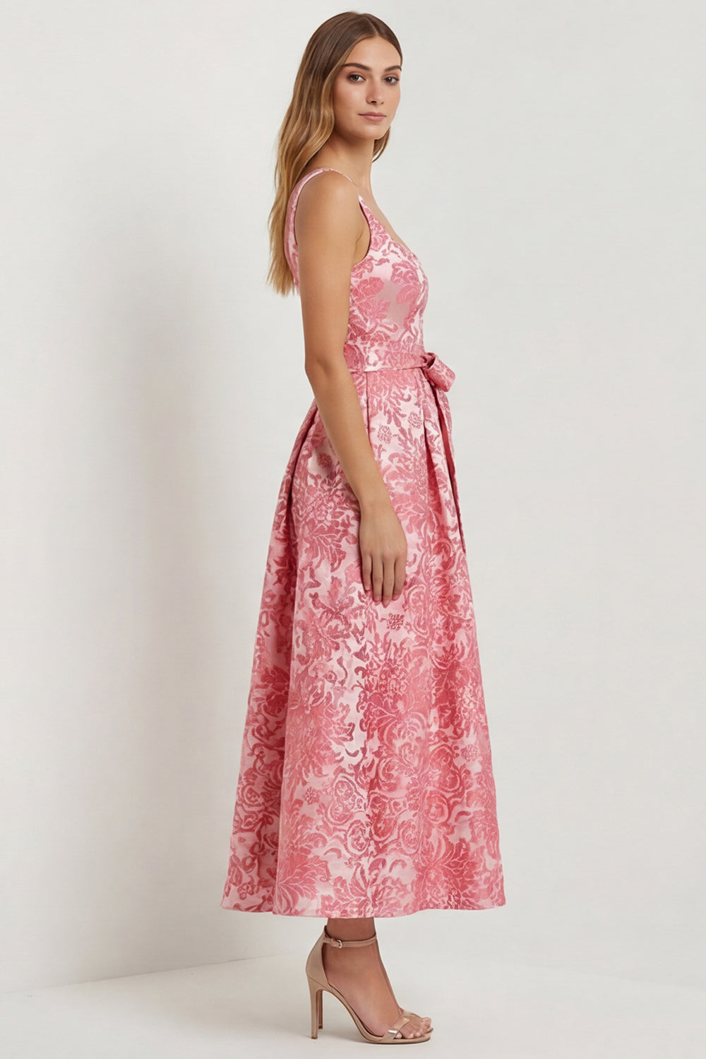 Hot Pink A Line Jacquard Square Neck Midi Wedding Guest Dress with Bow