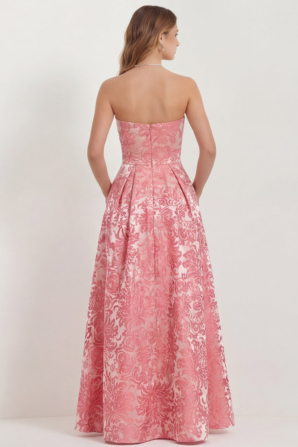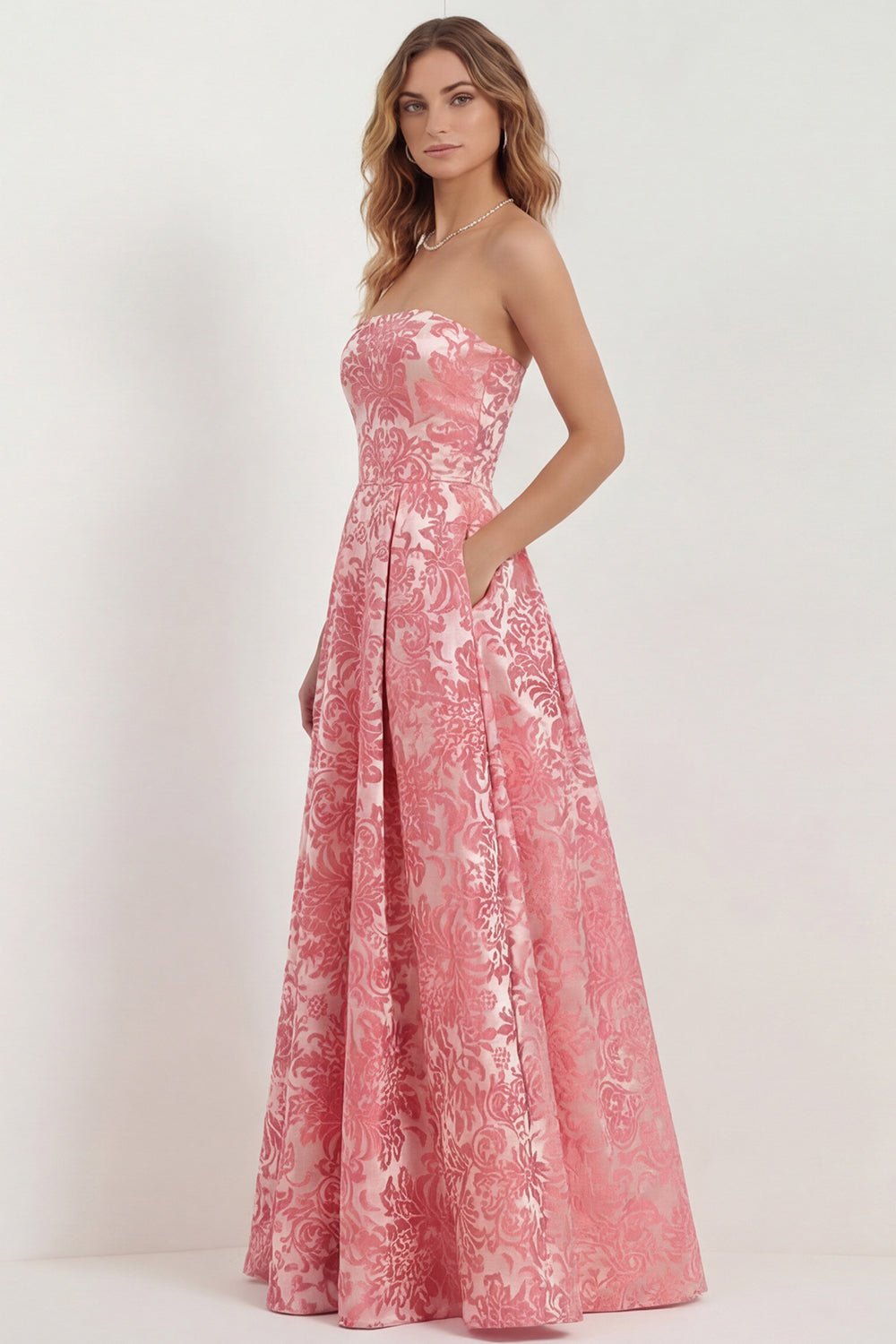 Hot Pink Strapless A Line Jacquard Long Bridesmaid Dress with Pockets