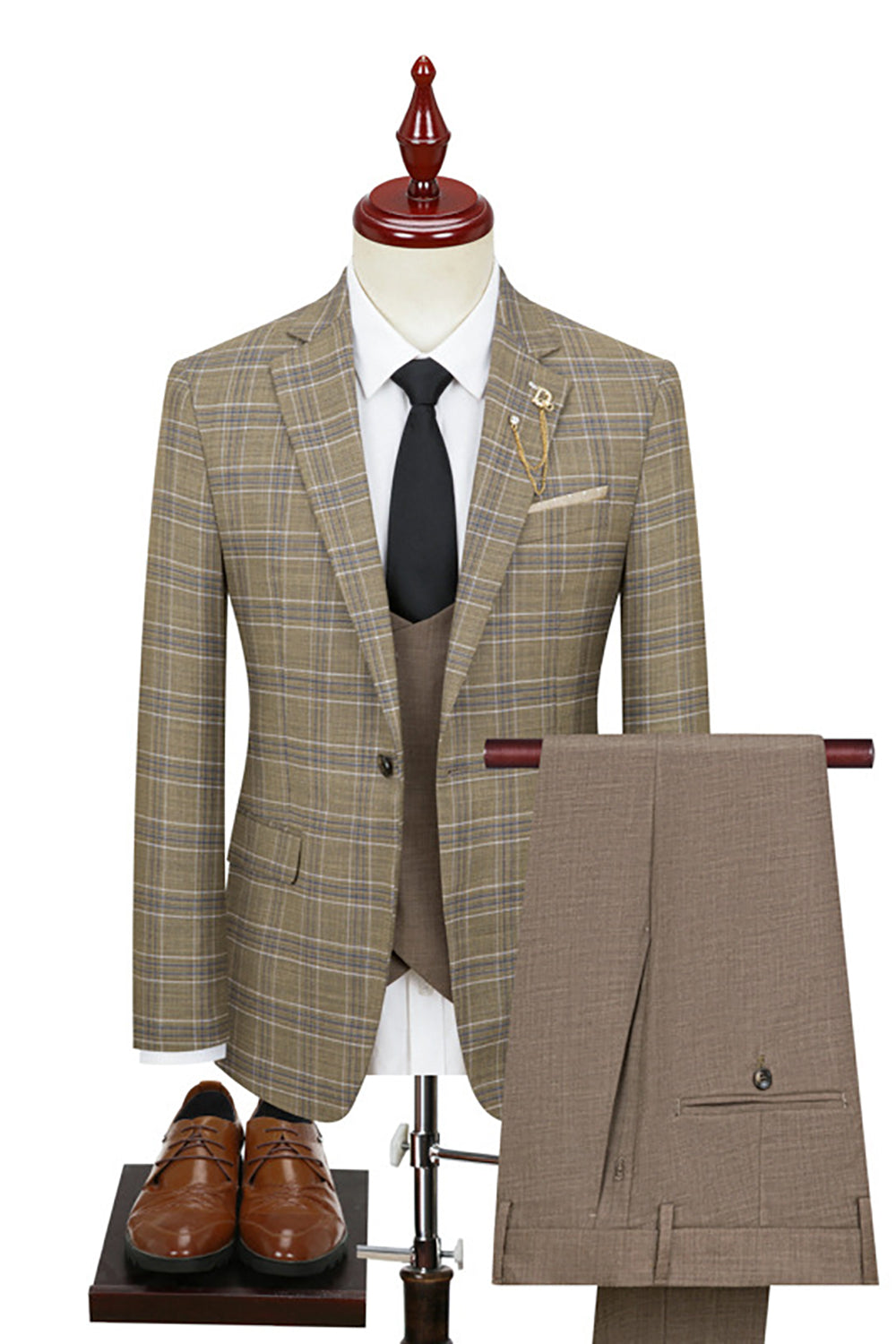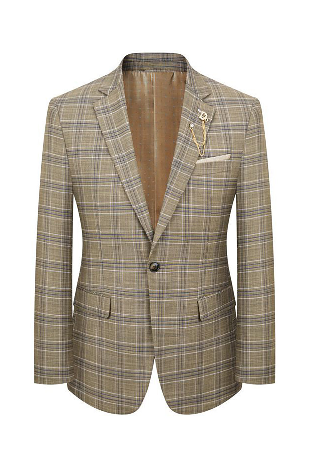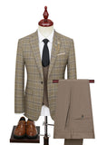 Men's Khaki Silm Fit Plaid 3 Piece Notched Lapel One Button Wedding Guest Suits