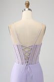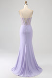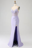 Lavender Mermaid Cutout Glitter Corset Satin Prom Dresses with Pleated Split