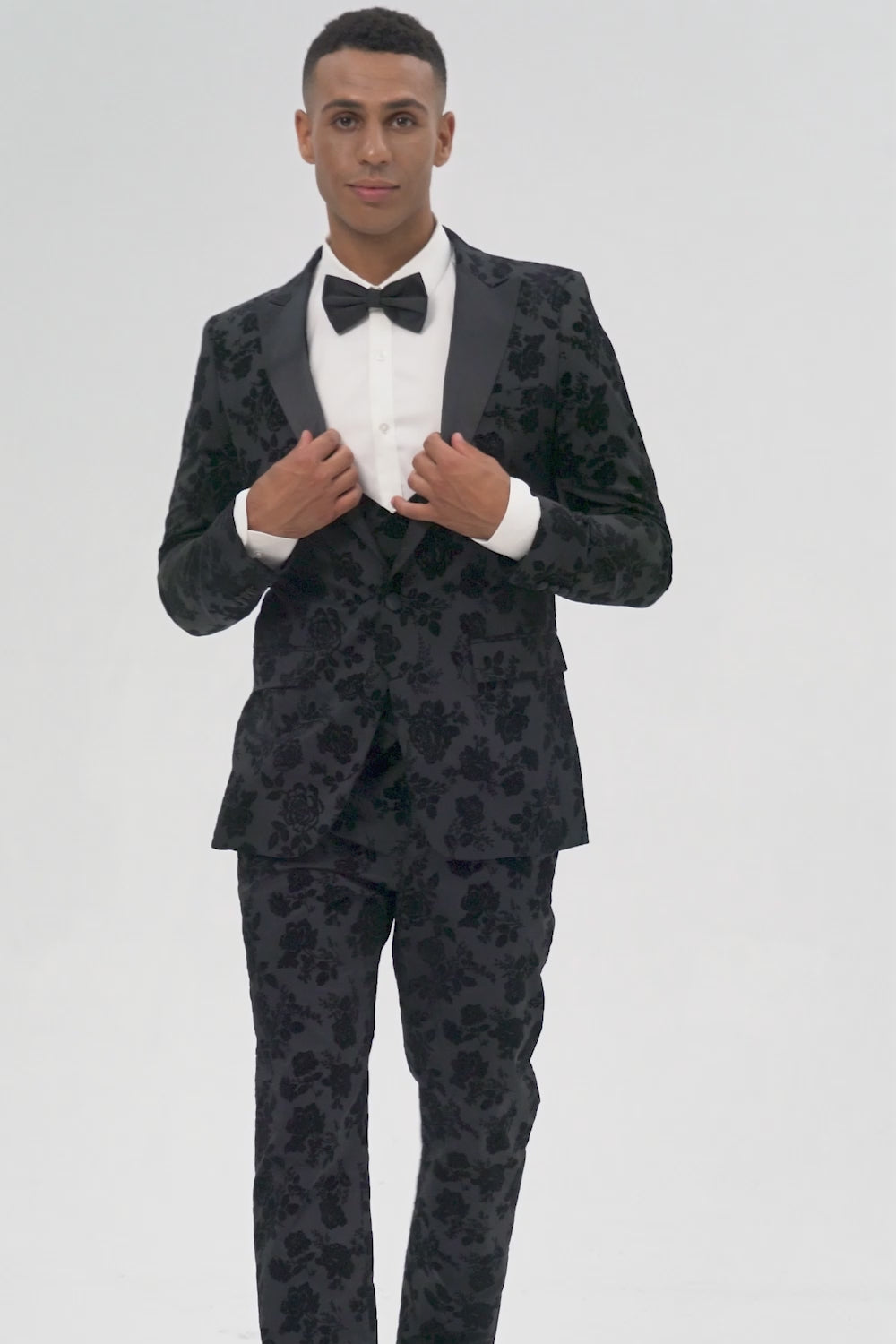 Men's Black Peak Lapel Jacquard One Button 3 Piece Wedding Suits