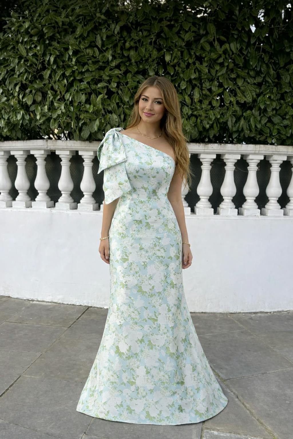 Blue White Flower Mermaid One Shoulder Print Long Bridesmaid Dress with Bow