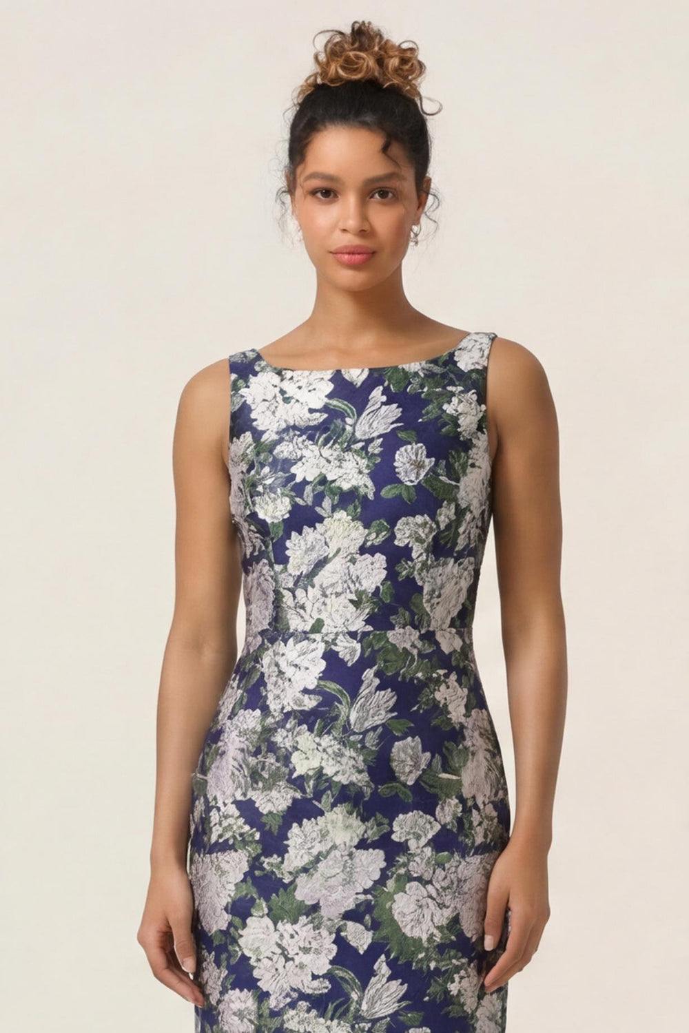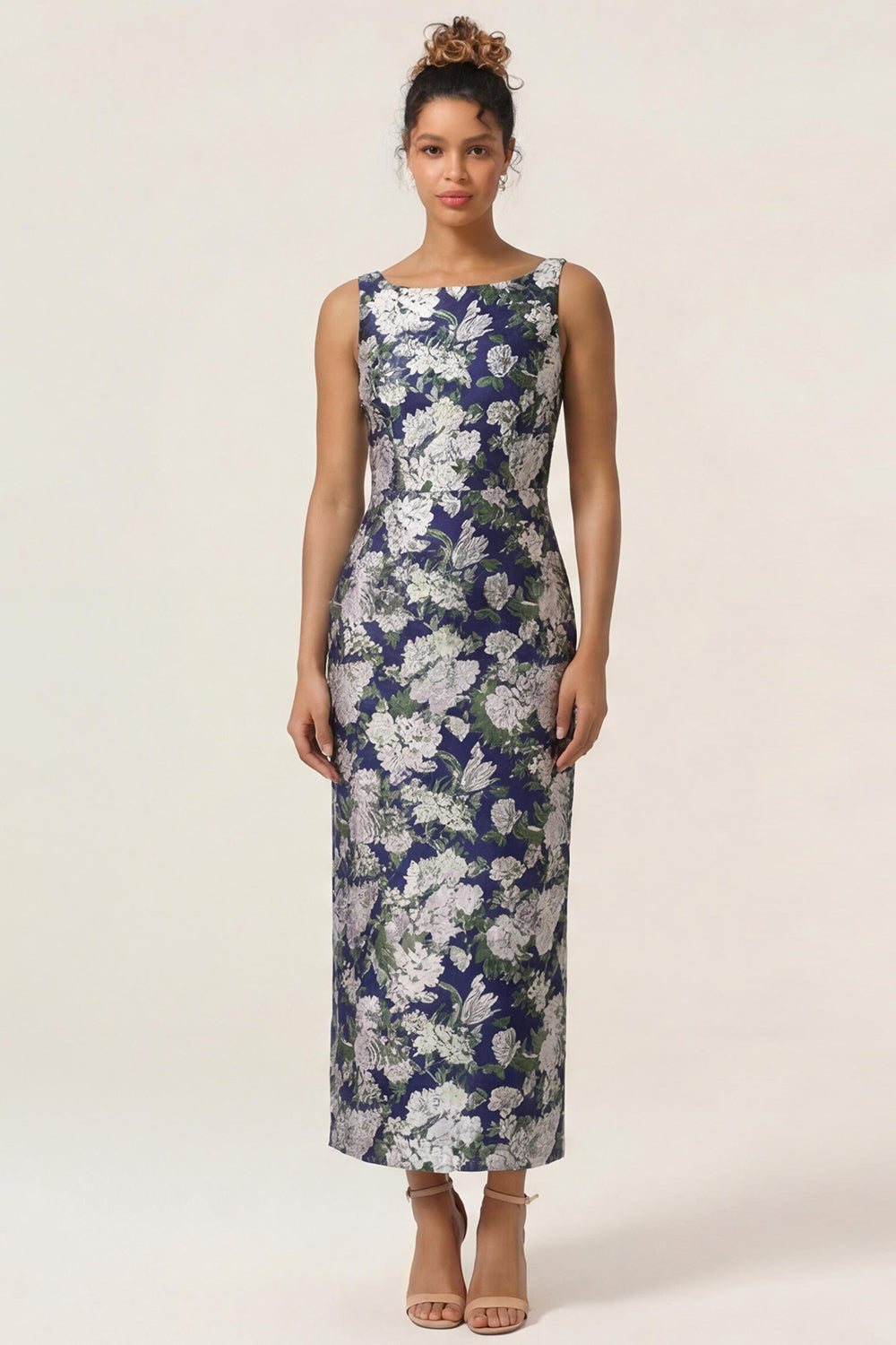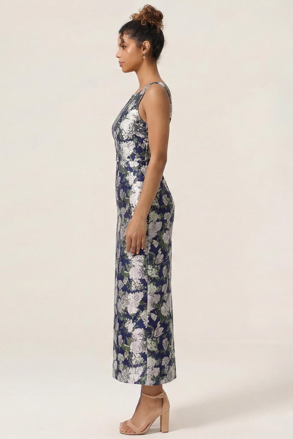 Navy Flower Sheath Printed Ankle Length Bridesmaid Dress with Slit