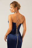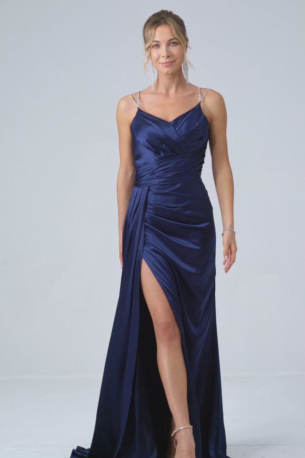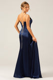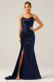 Navy Mermaid Spaghetti Straps Pleated Sequin Maxi Dress With Slit
