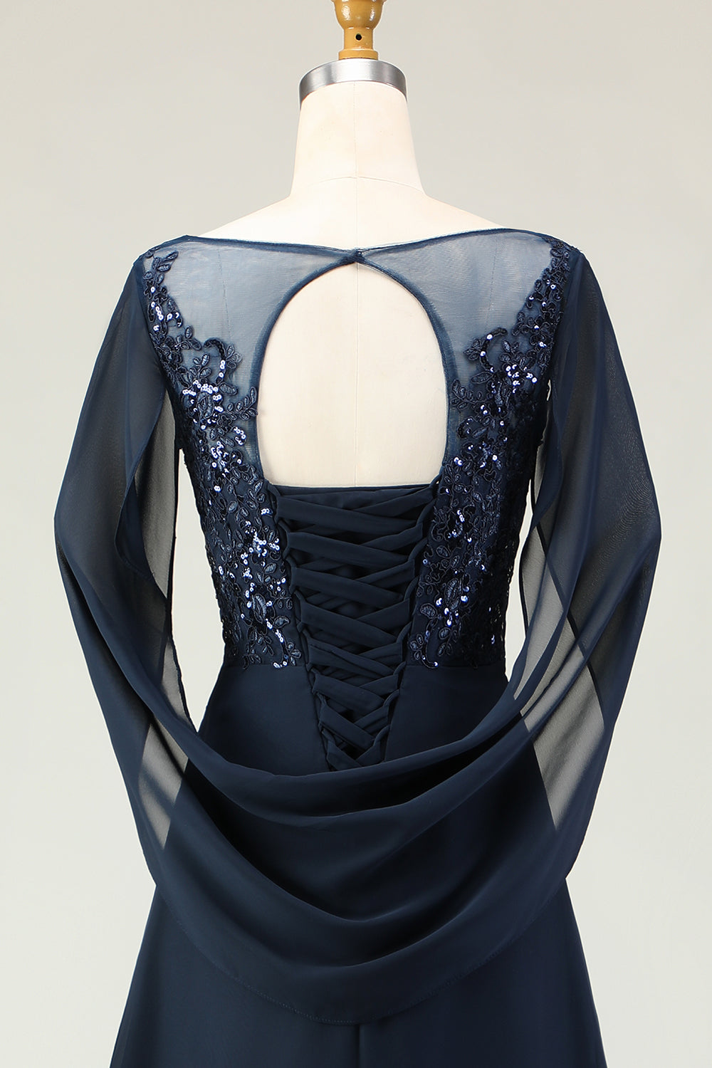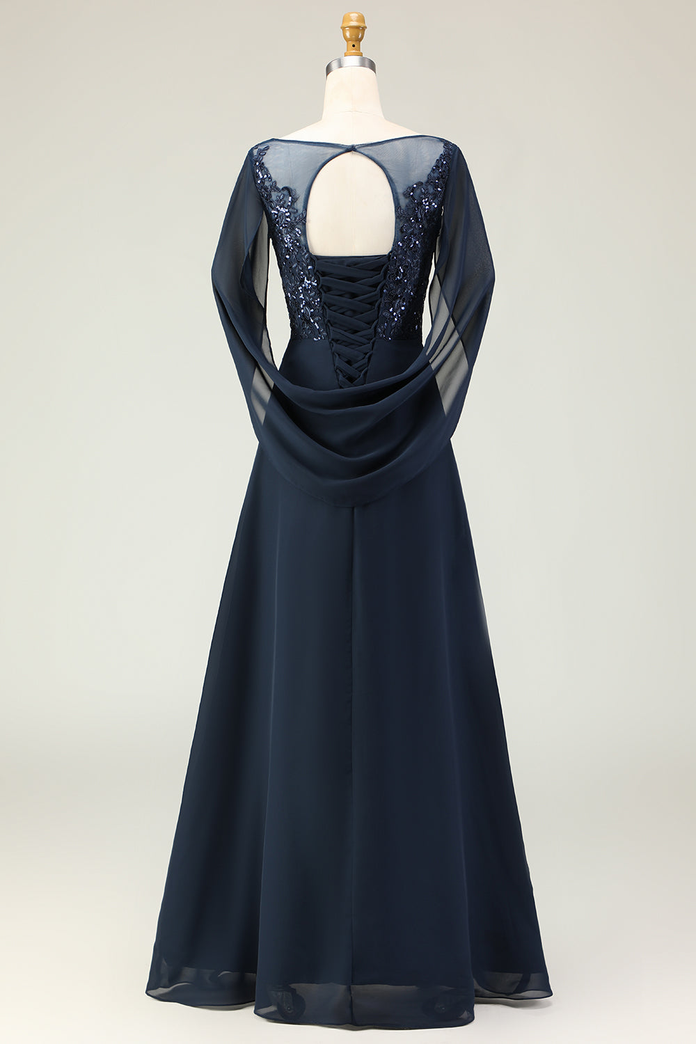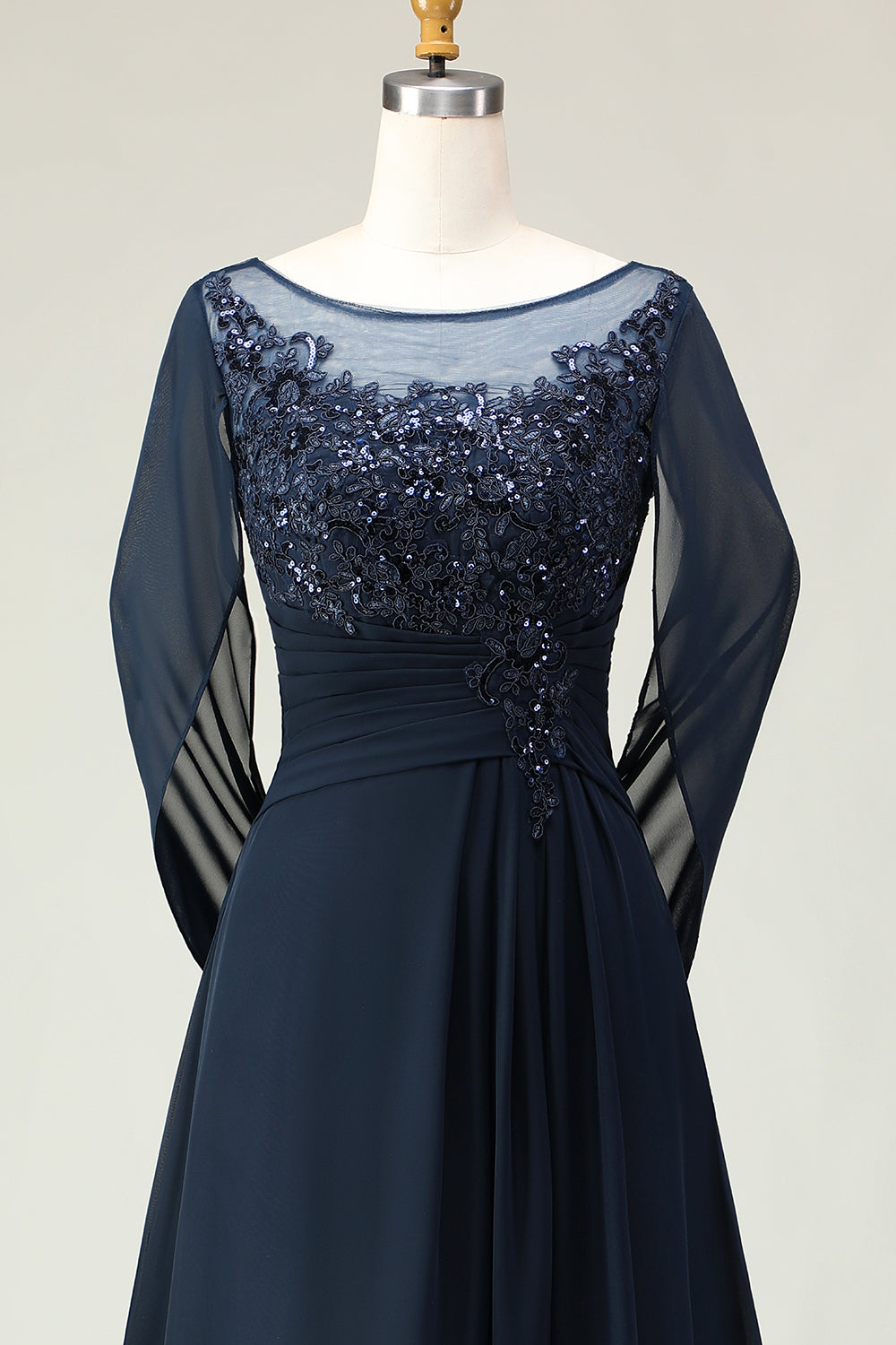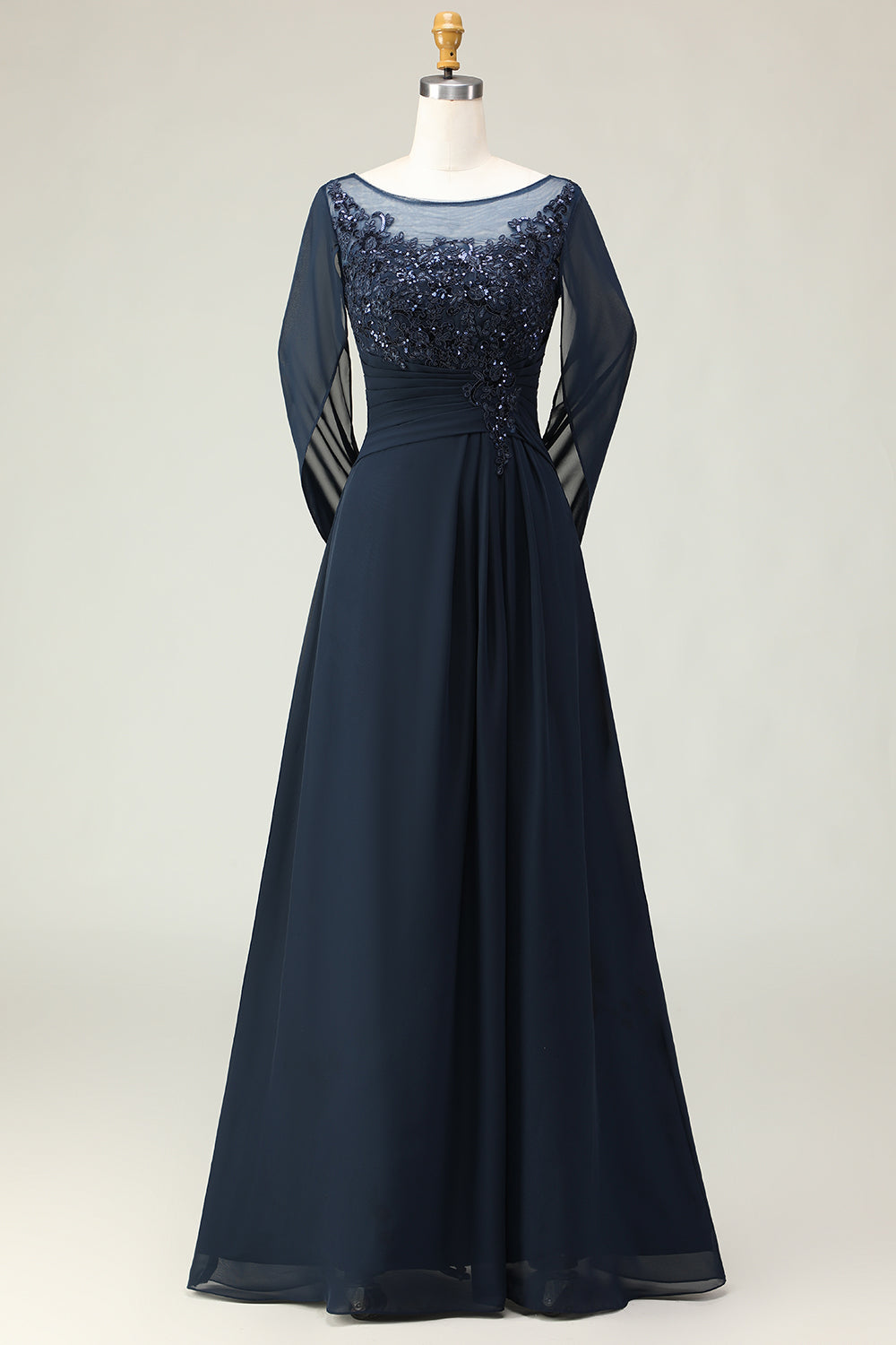 Navy Sequin A Line Round Neck Long Mother of the Bride Dress with Sheer Sleeves