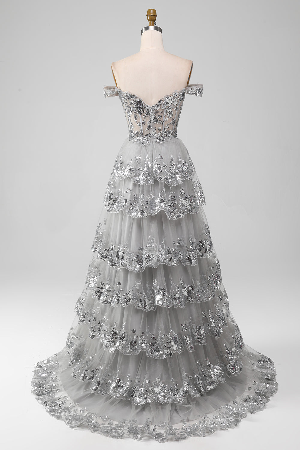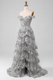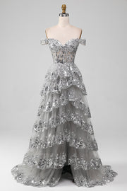 Grey A-Line Off the Shoulder Sparkly Tiered Prom Dress with Slit