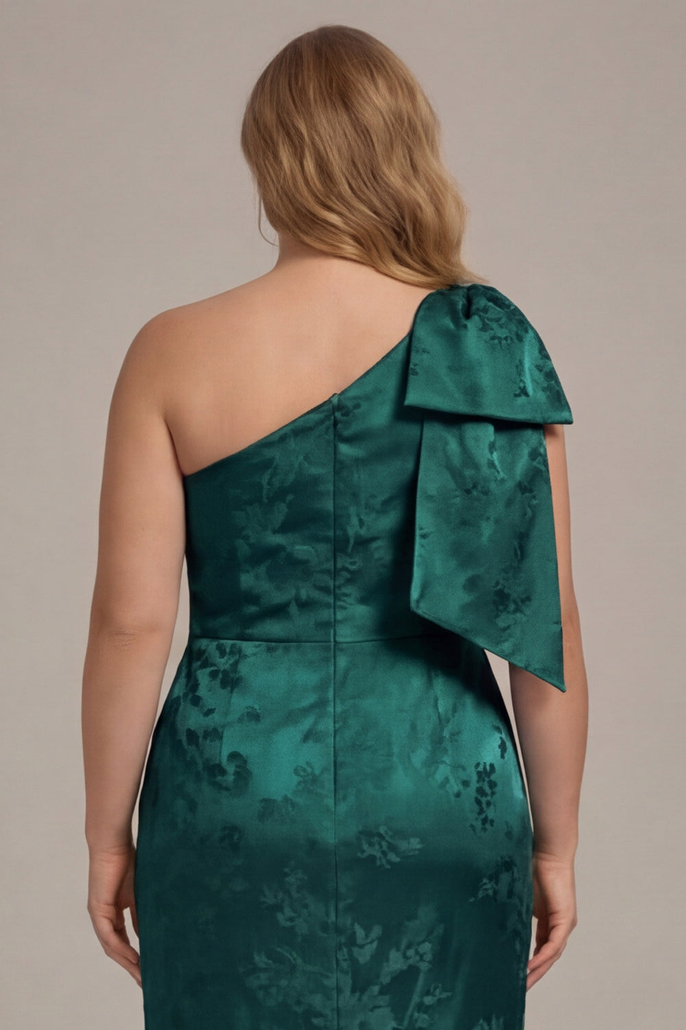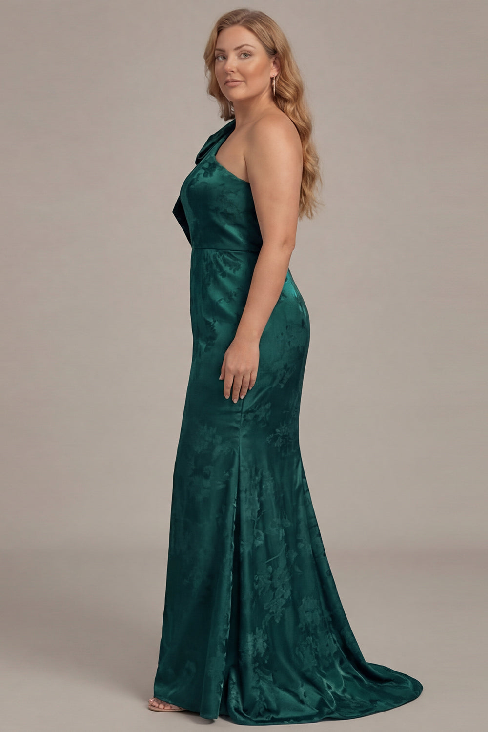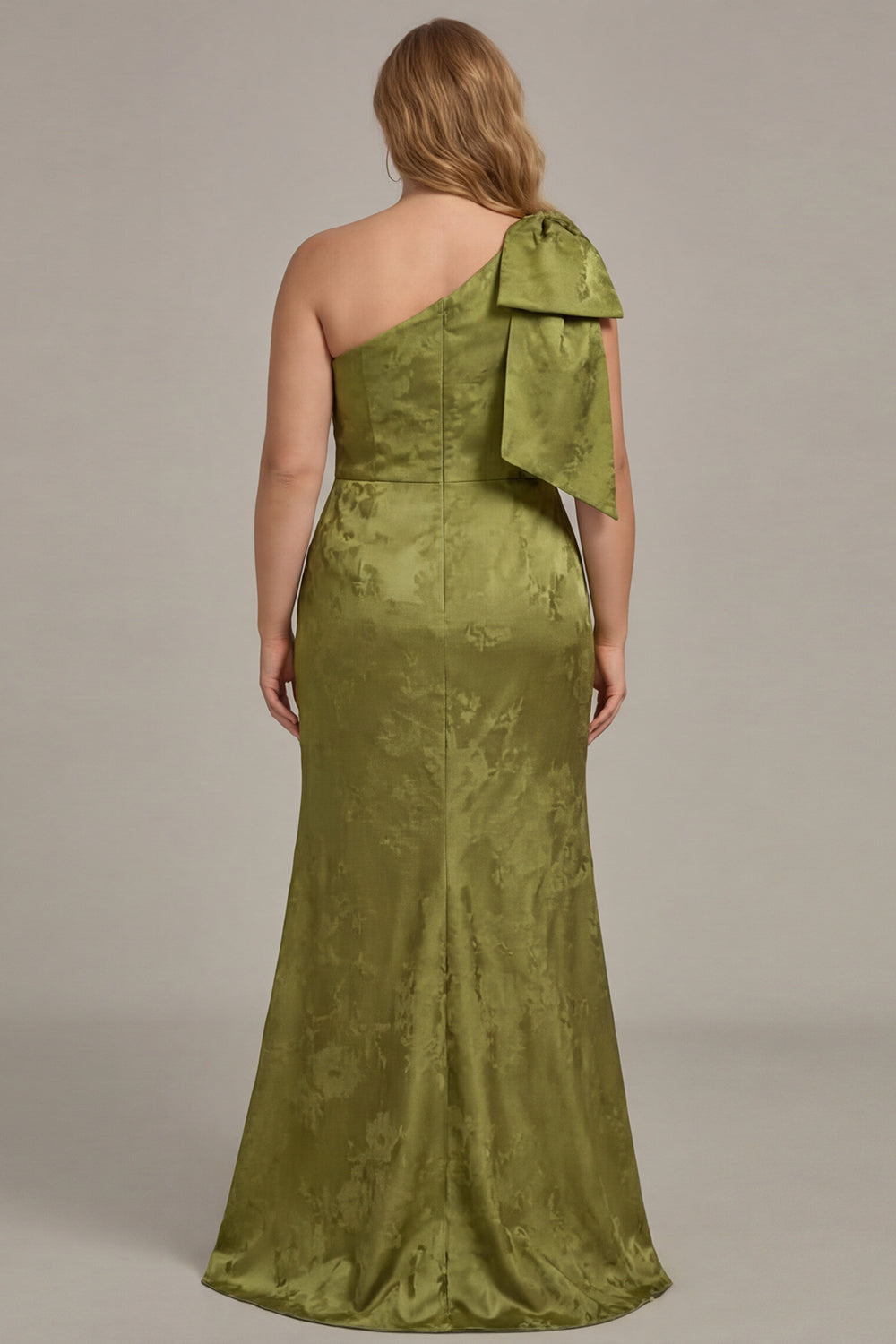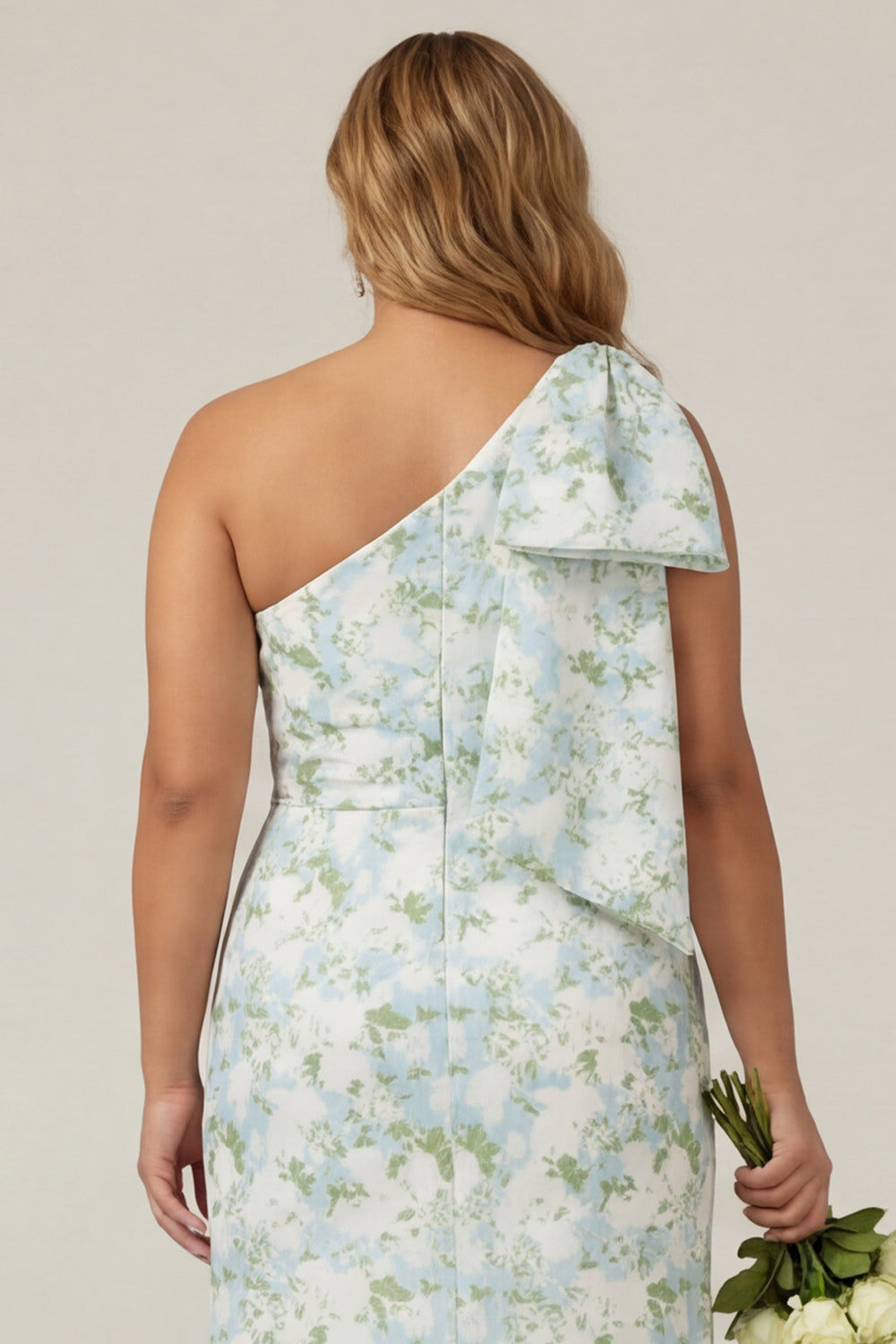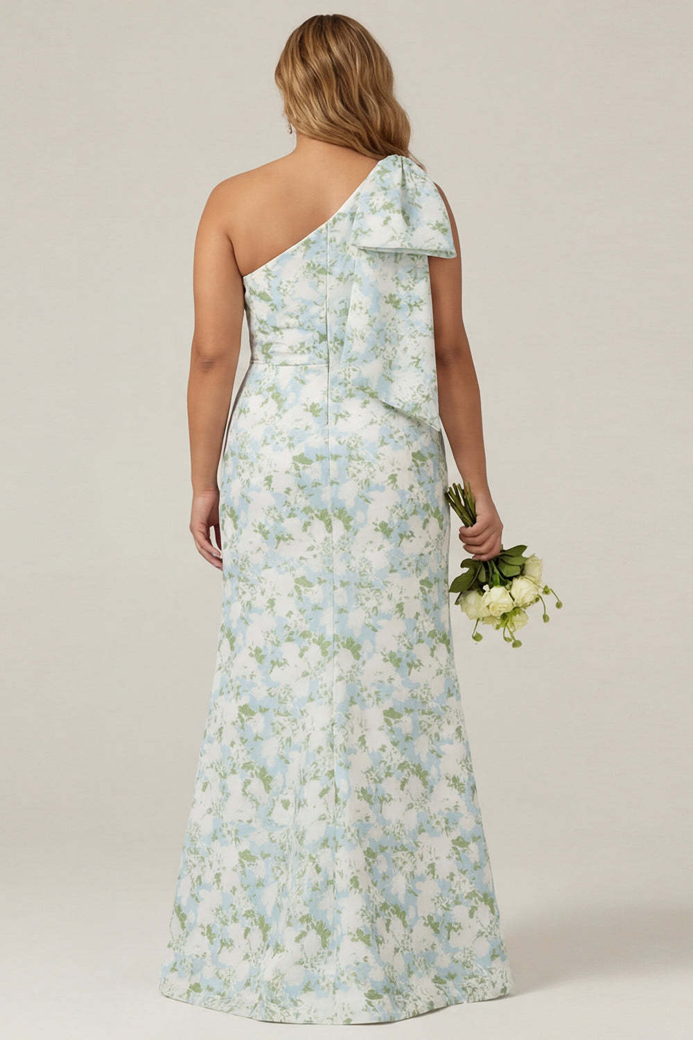 One Shoulder Blue White Flower Print Mermaid Plus Size Bridesmaid Dress with Bow