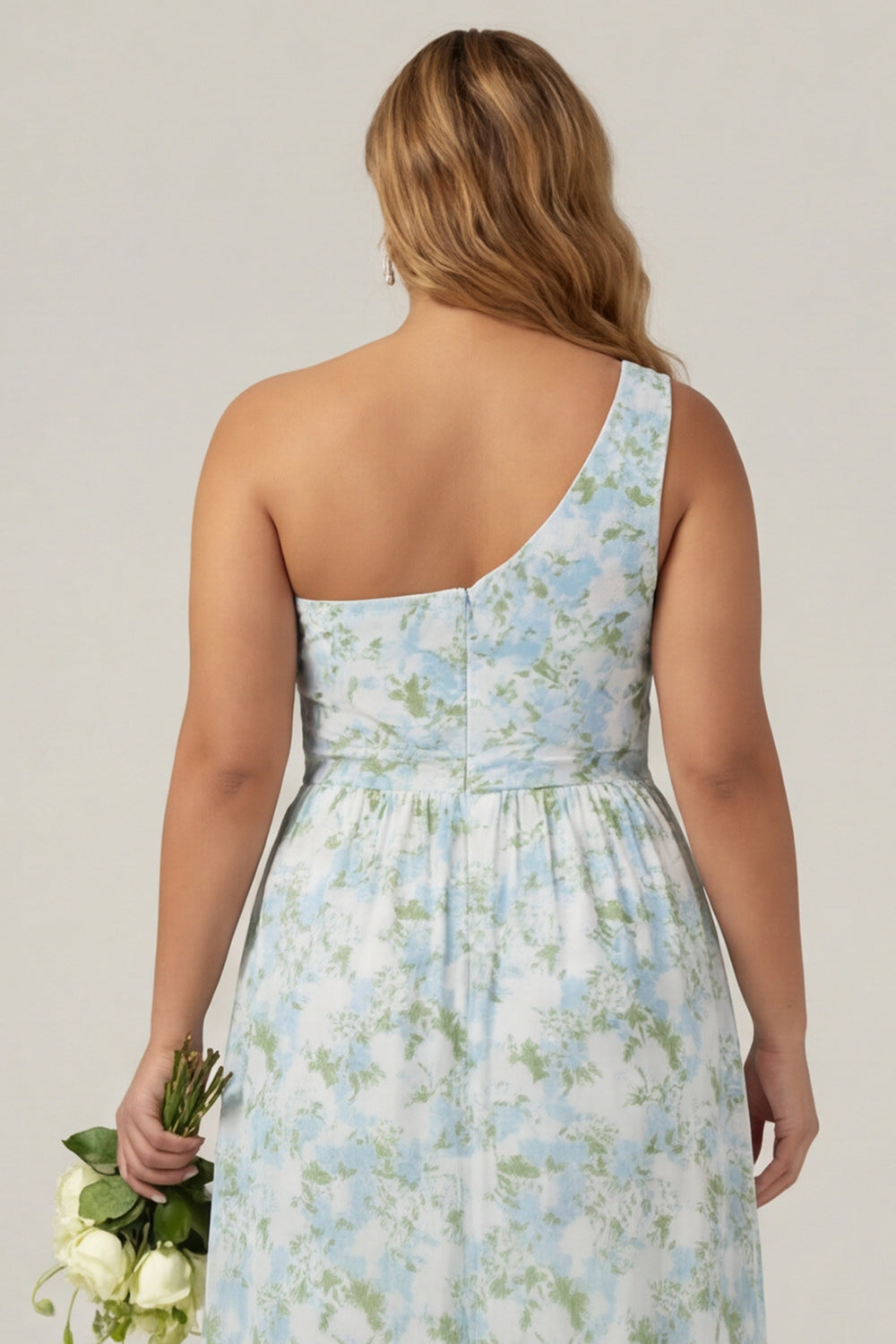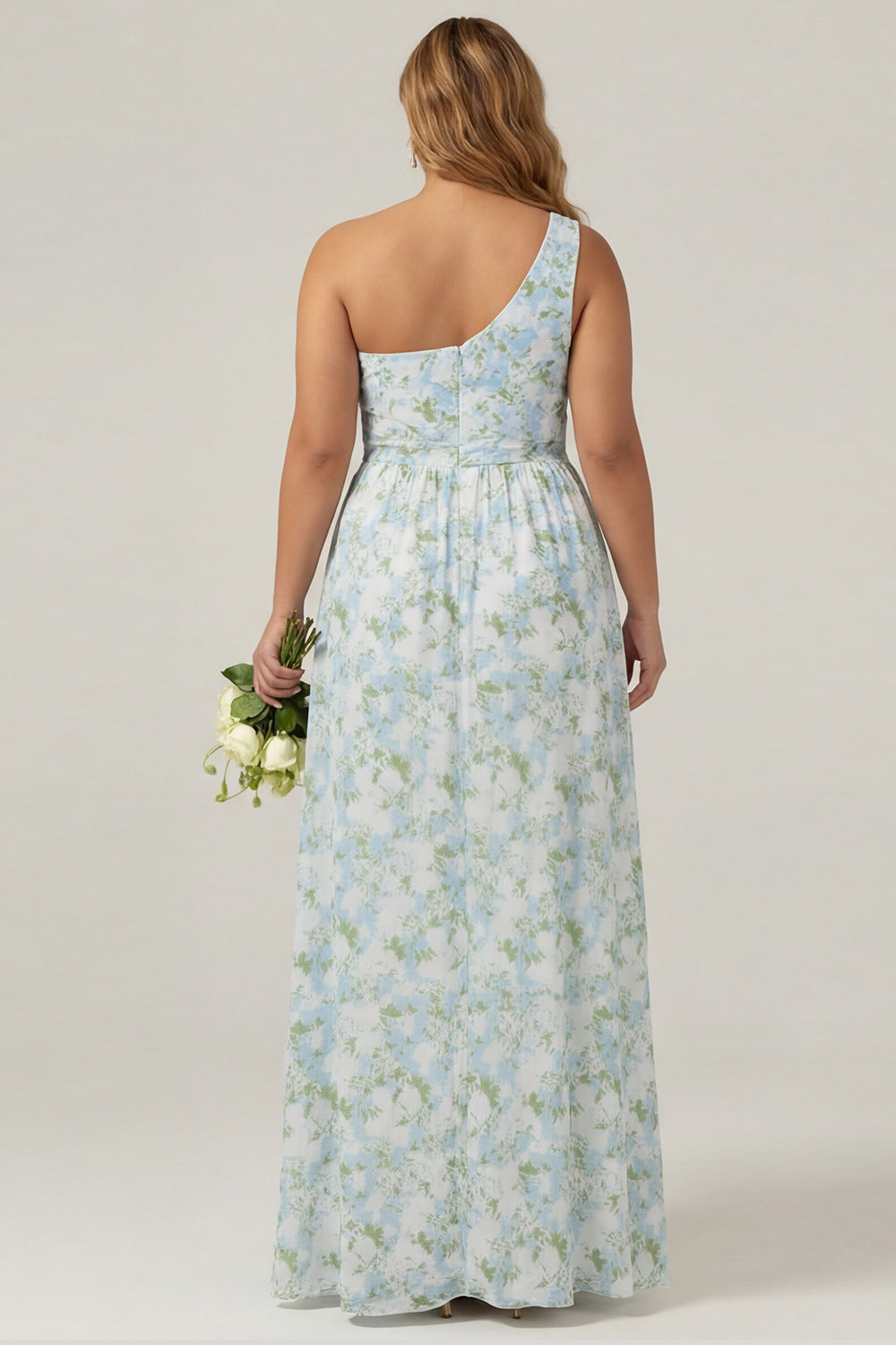 One Shoulder Blue White Flower Print Sheath Long Plus Size Bridesmaid Dress with Slit