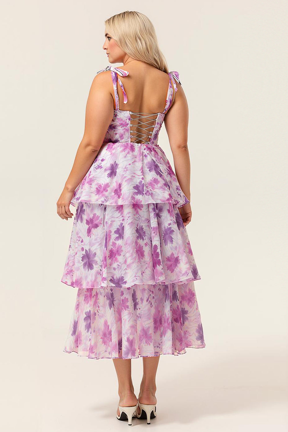 Purple Flower A-Line Lace Up Back Tiered Print Midi Plus Size Dress with Straps Bows