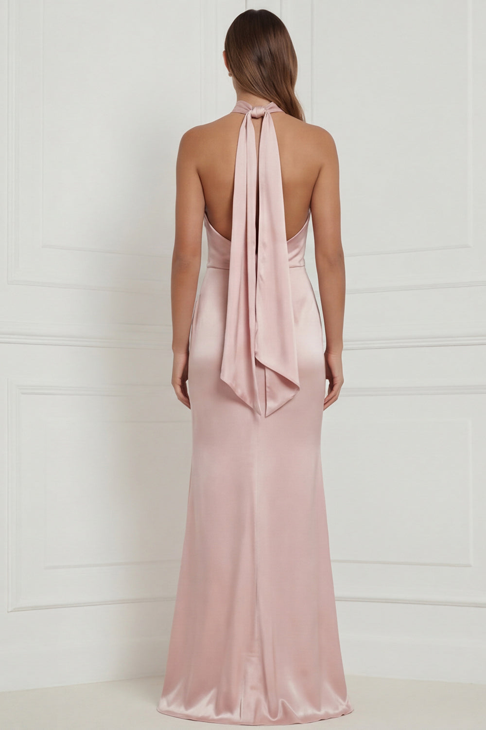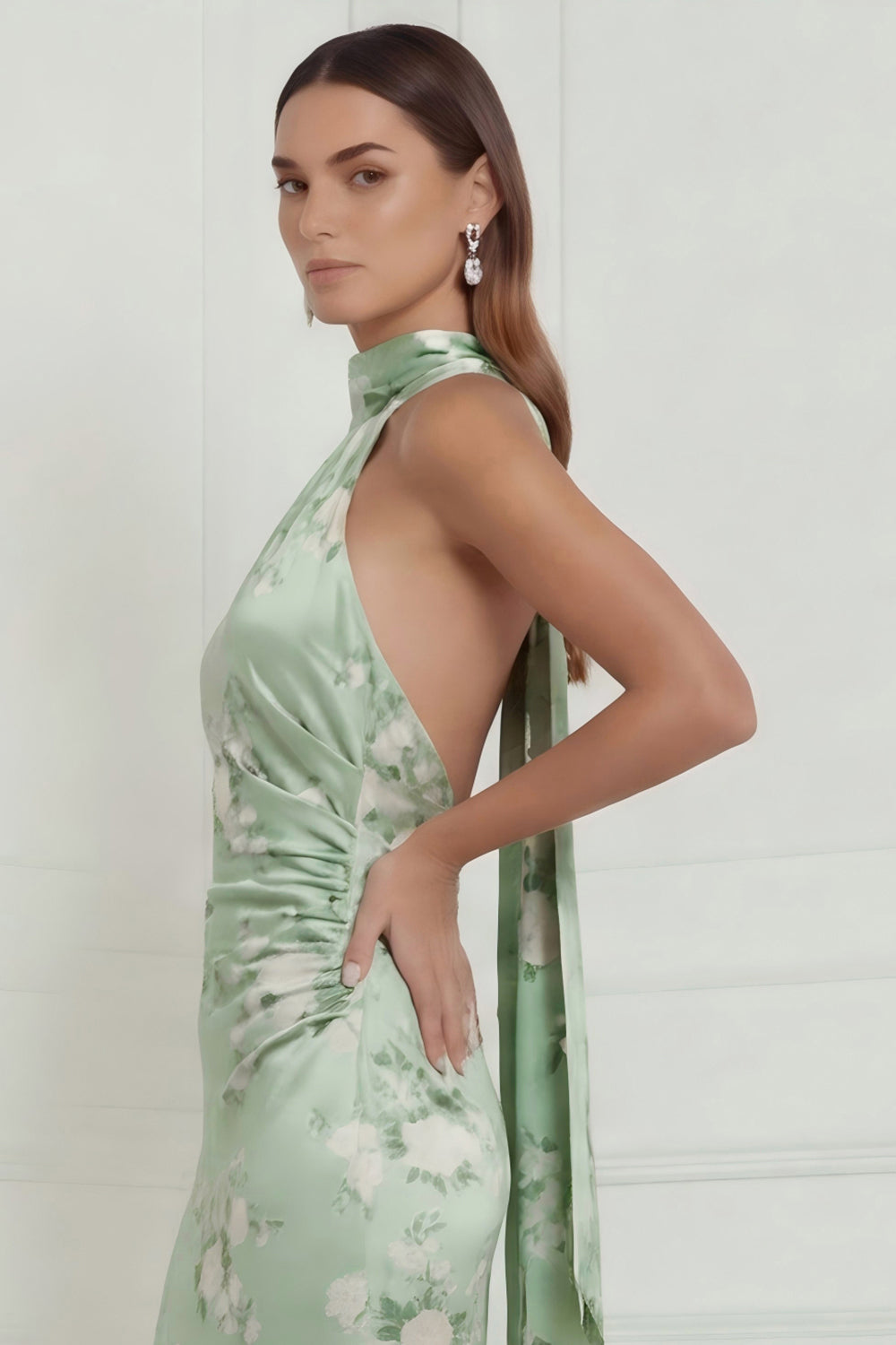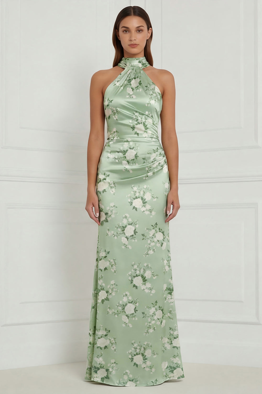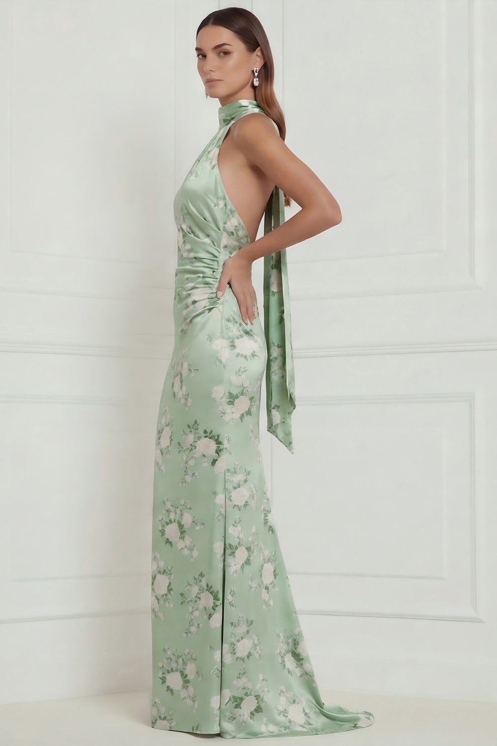 Sage Green Floral Mermaid Halter Printed Long Bridesmaid Dress with Streamer