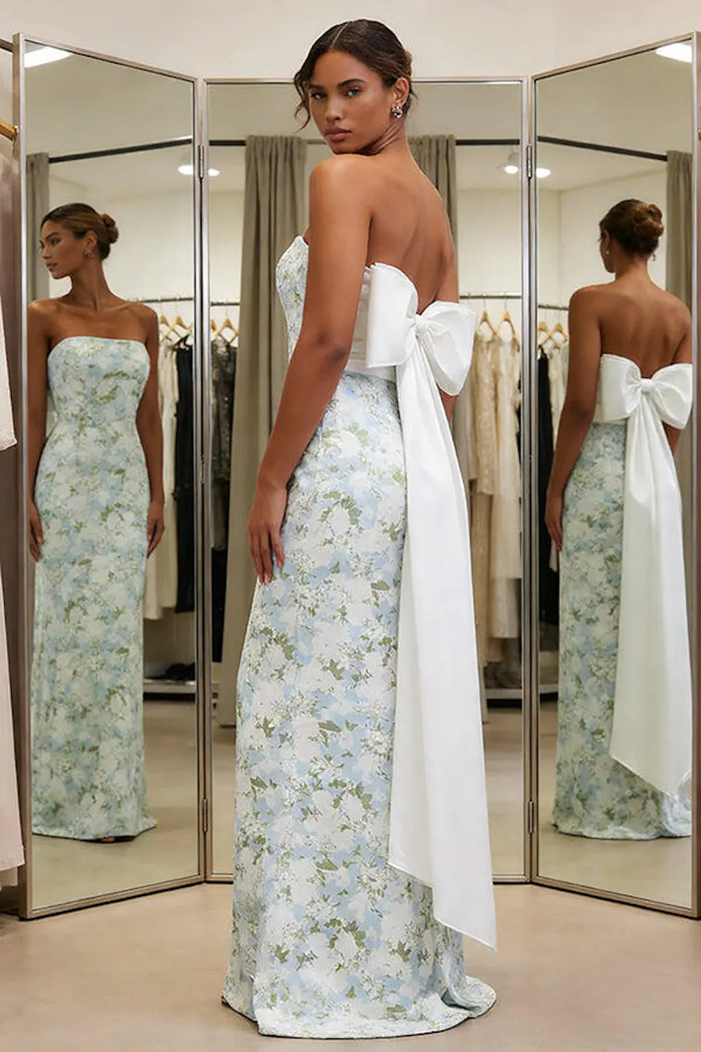 Sheath Strapless Blue White Flower Satin Long Bridesmaid Dress with Back Bow