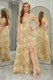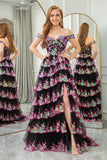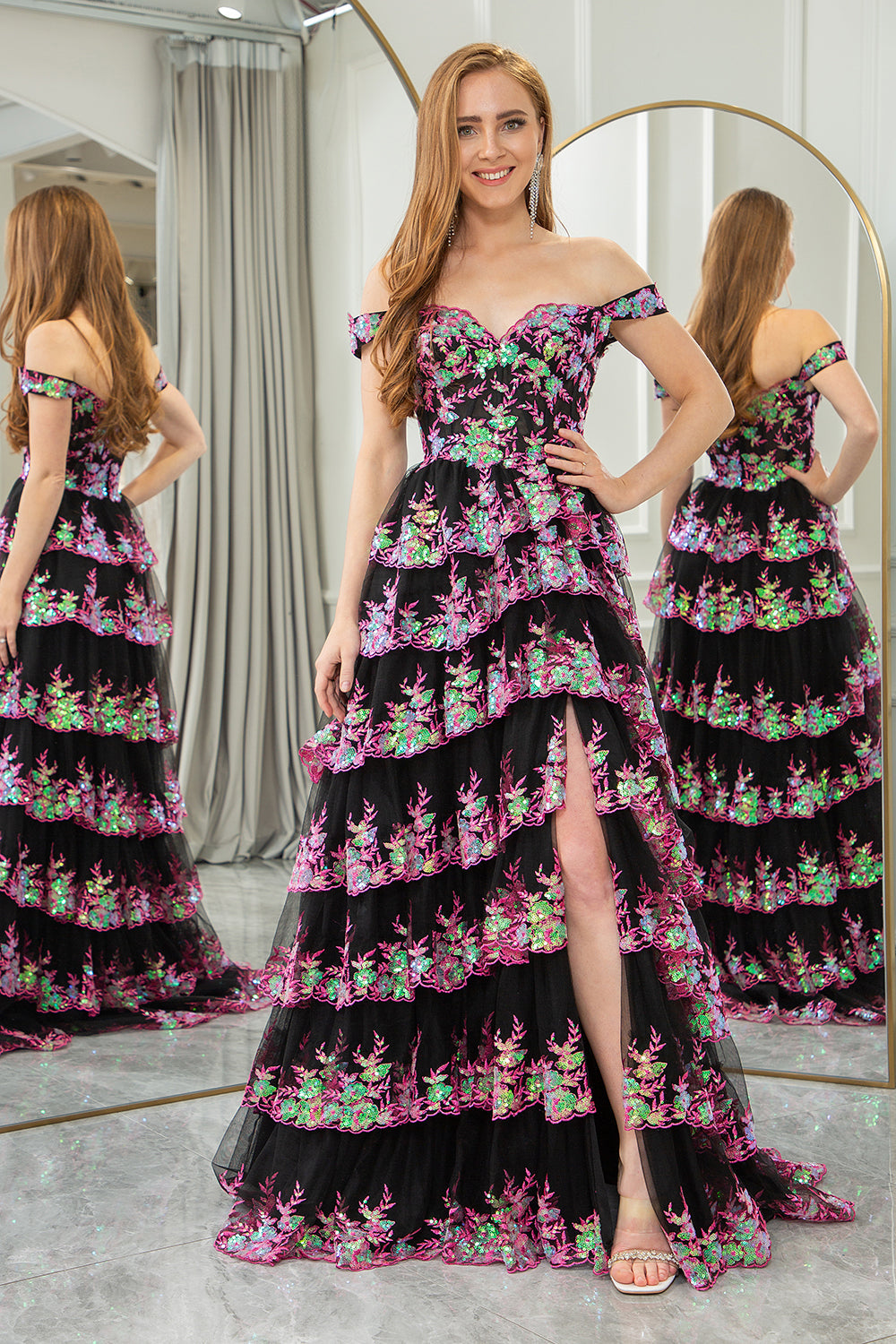 Sparkly Fuchsia A-Line Off The Shoulder Tiered Long Prom Dress with Slit