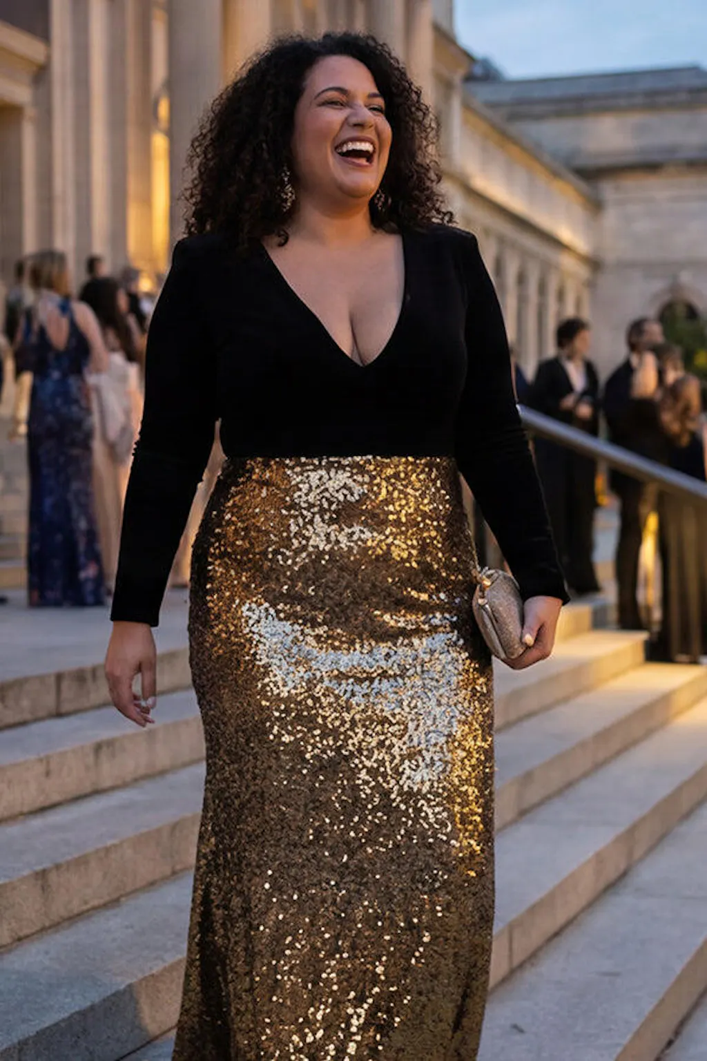 Sparkly Gold and Black Velvet V-Neck Formal Dress with Long Sleeves