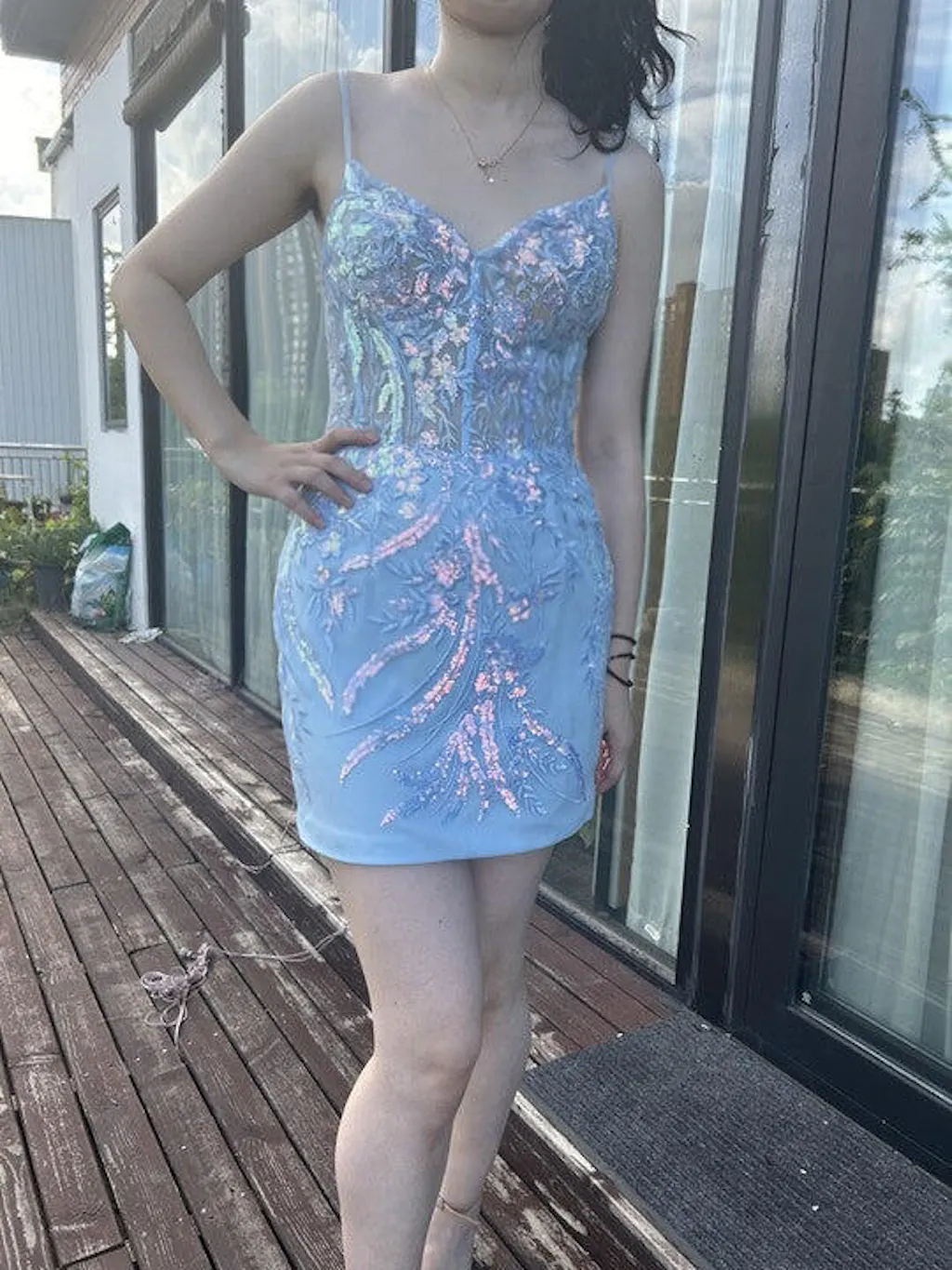 Sparkly Lilac Blue Bodycon Backless Corset Short Homecoming Dress with Sequins