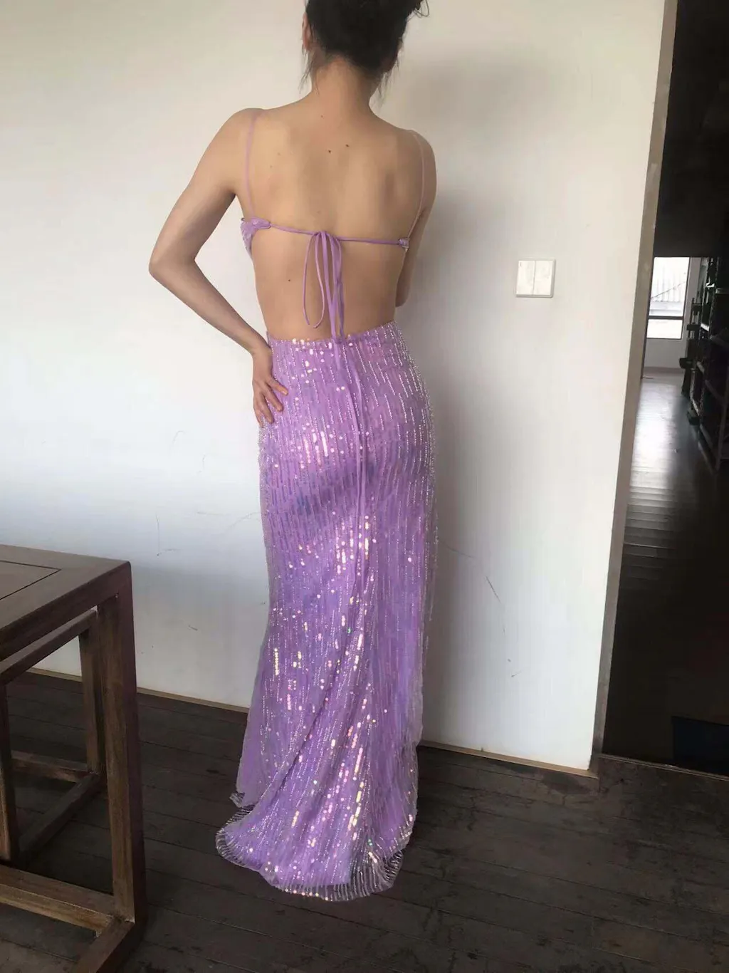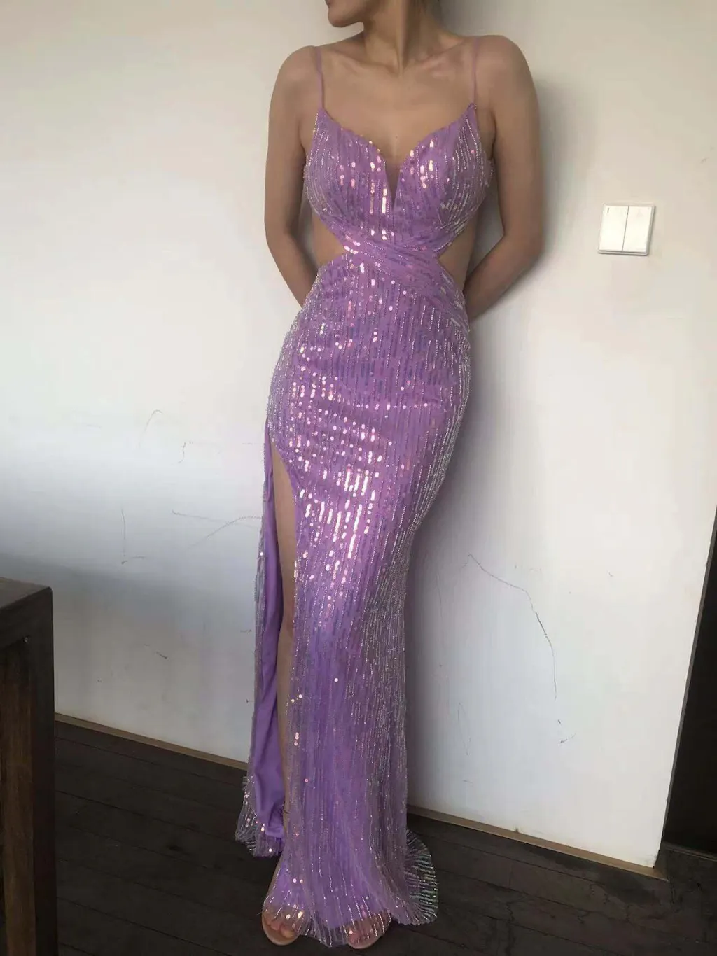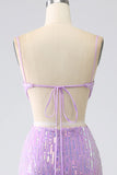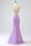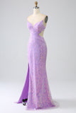 Sparkly Purple Mermaid Spaghetti Straps Sequins Prom Dress with Slit