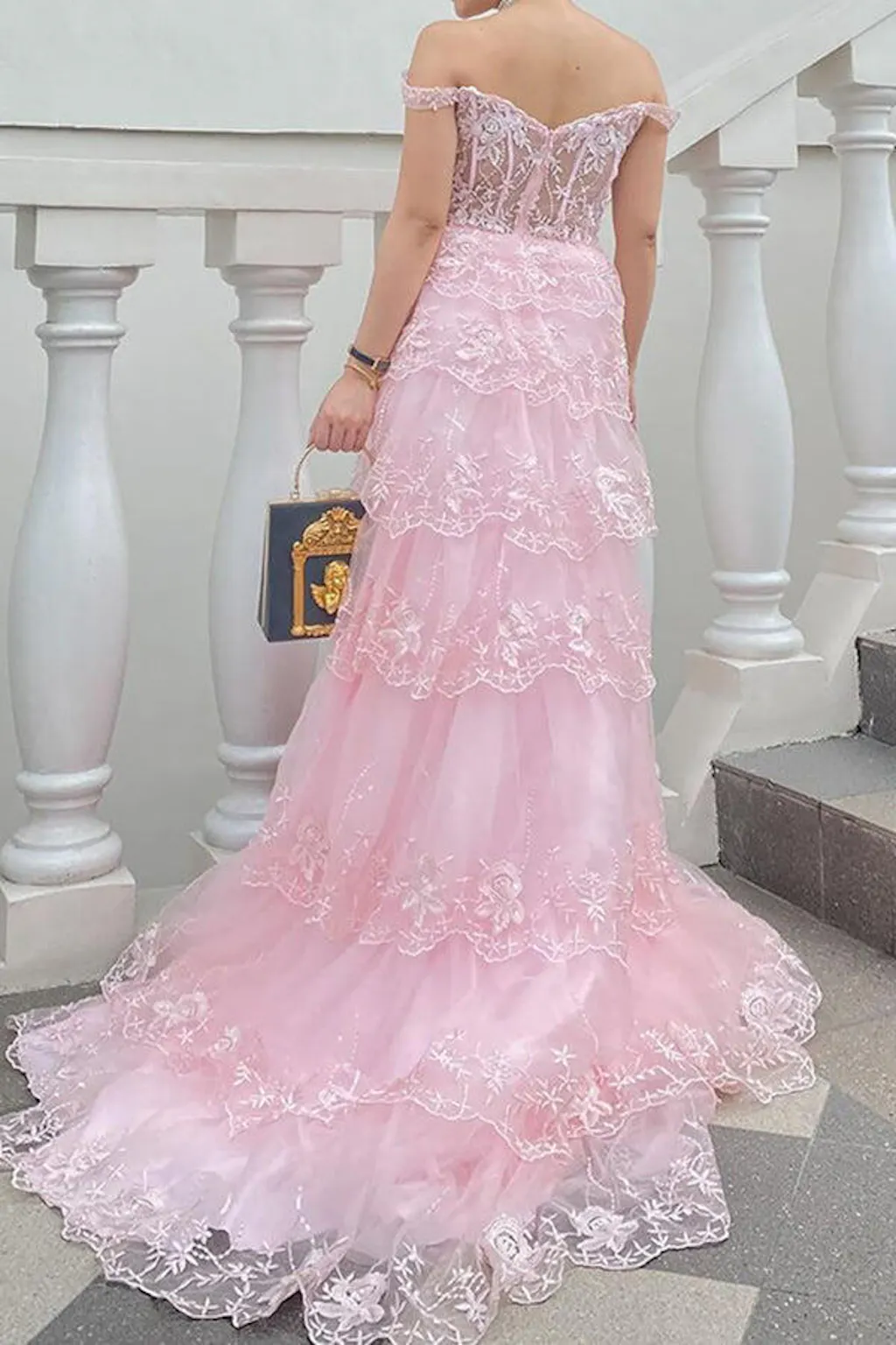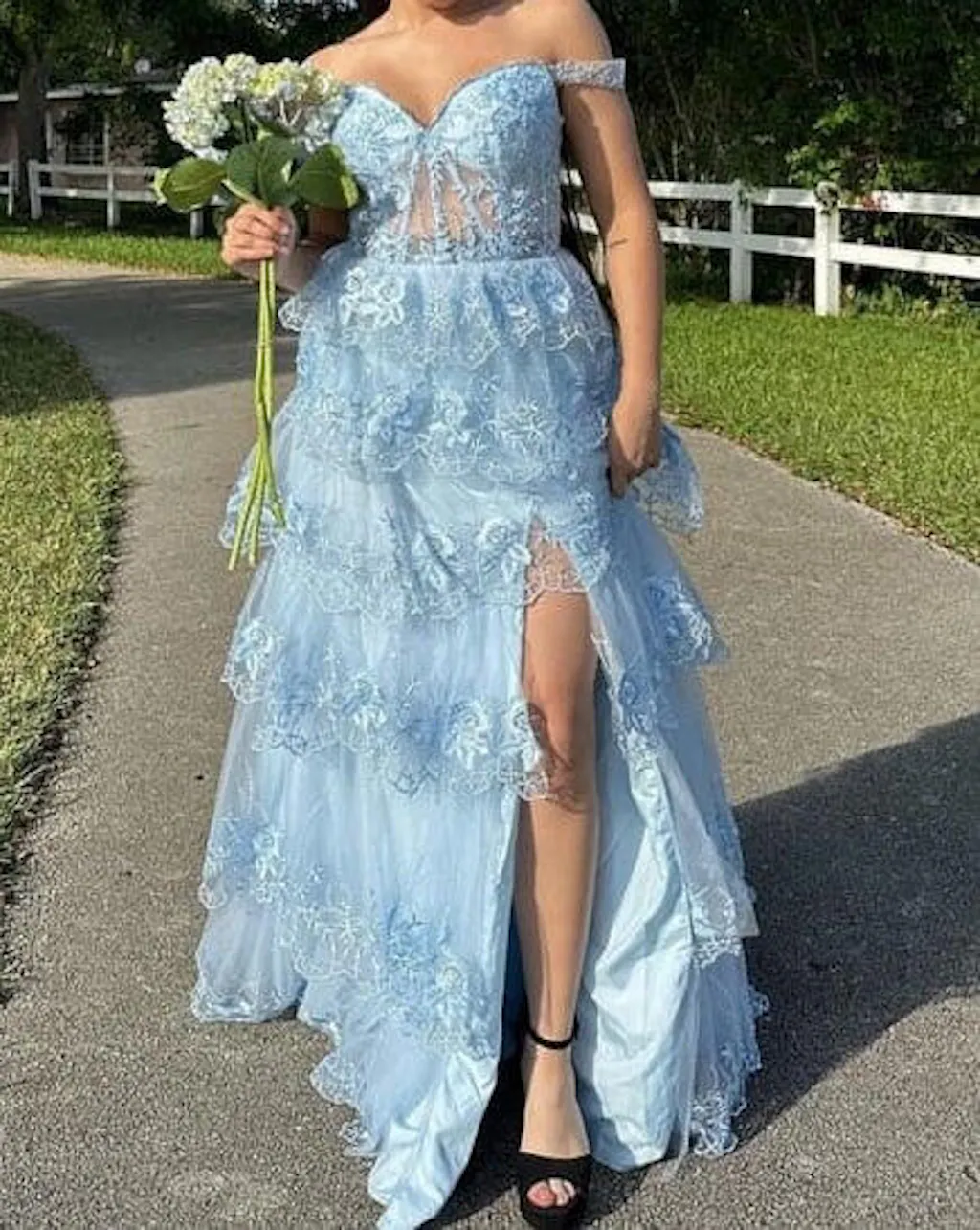 Sparkly Silver A-Line Off The Shoulder Tiered Long Prom Dress