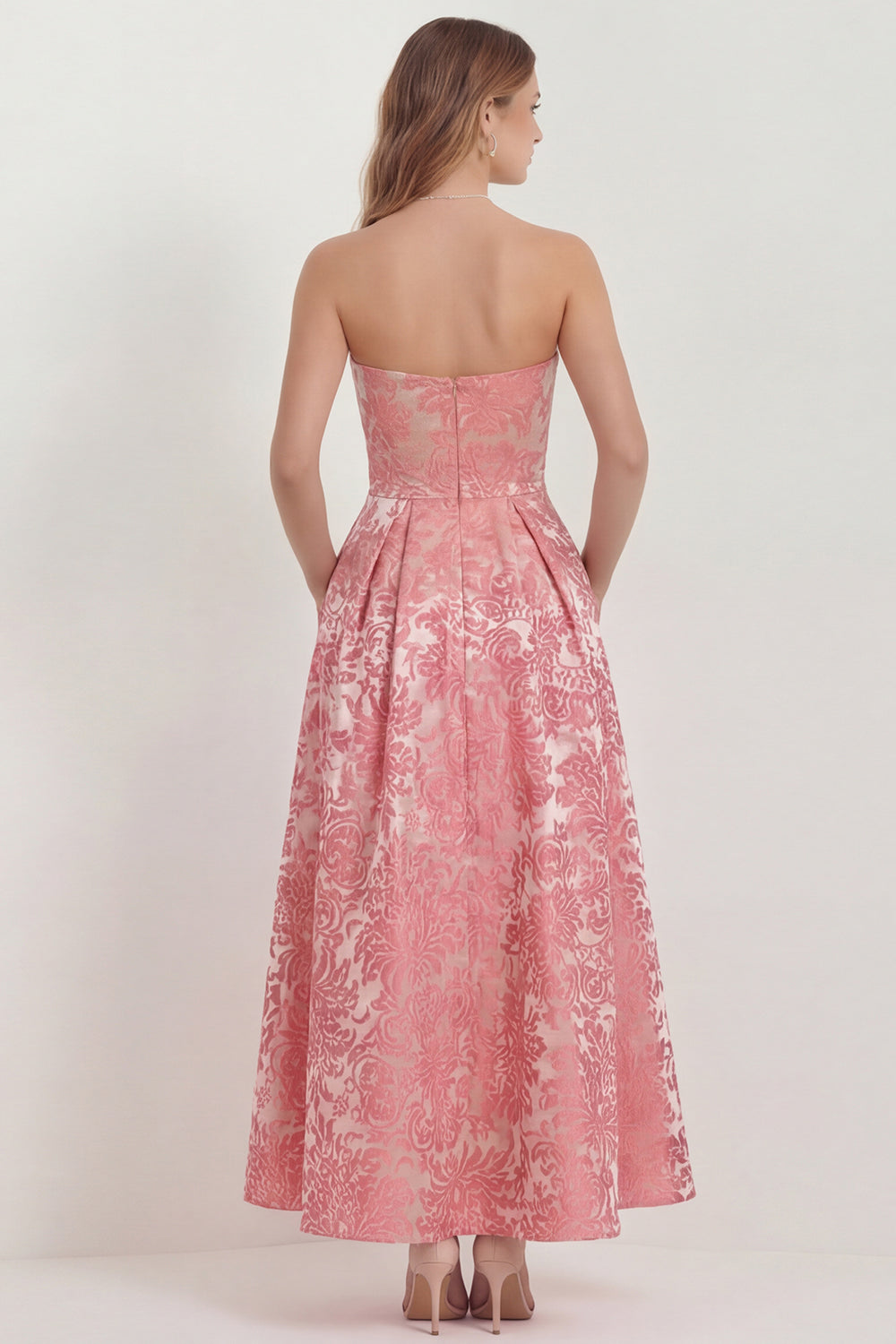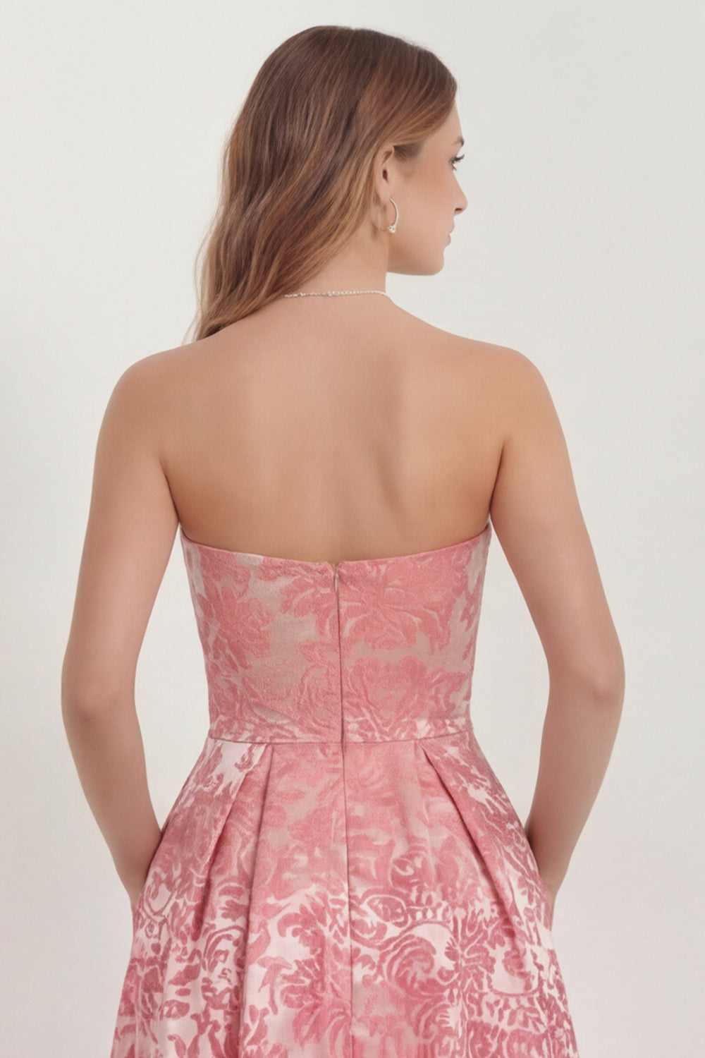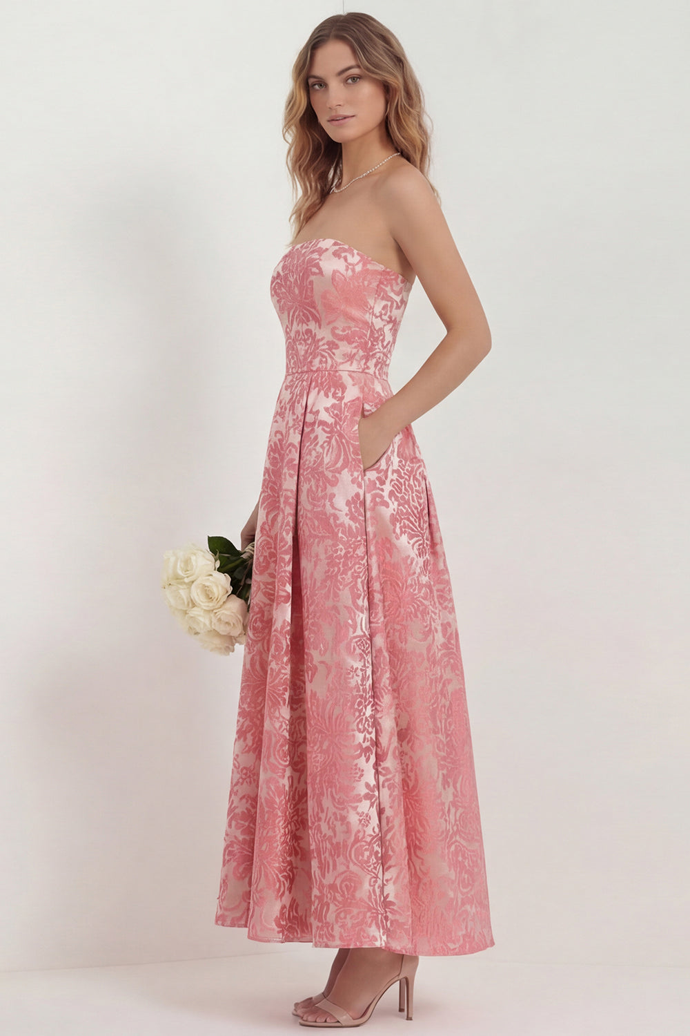Strapless A Line Hot Pink Jacquard Midi Wedding Guest Dress with Pockets