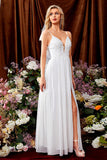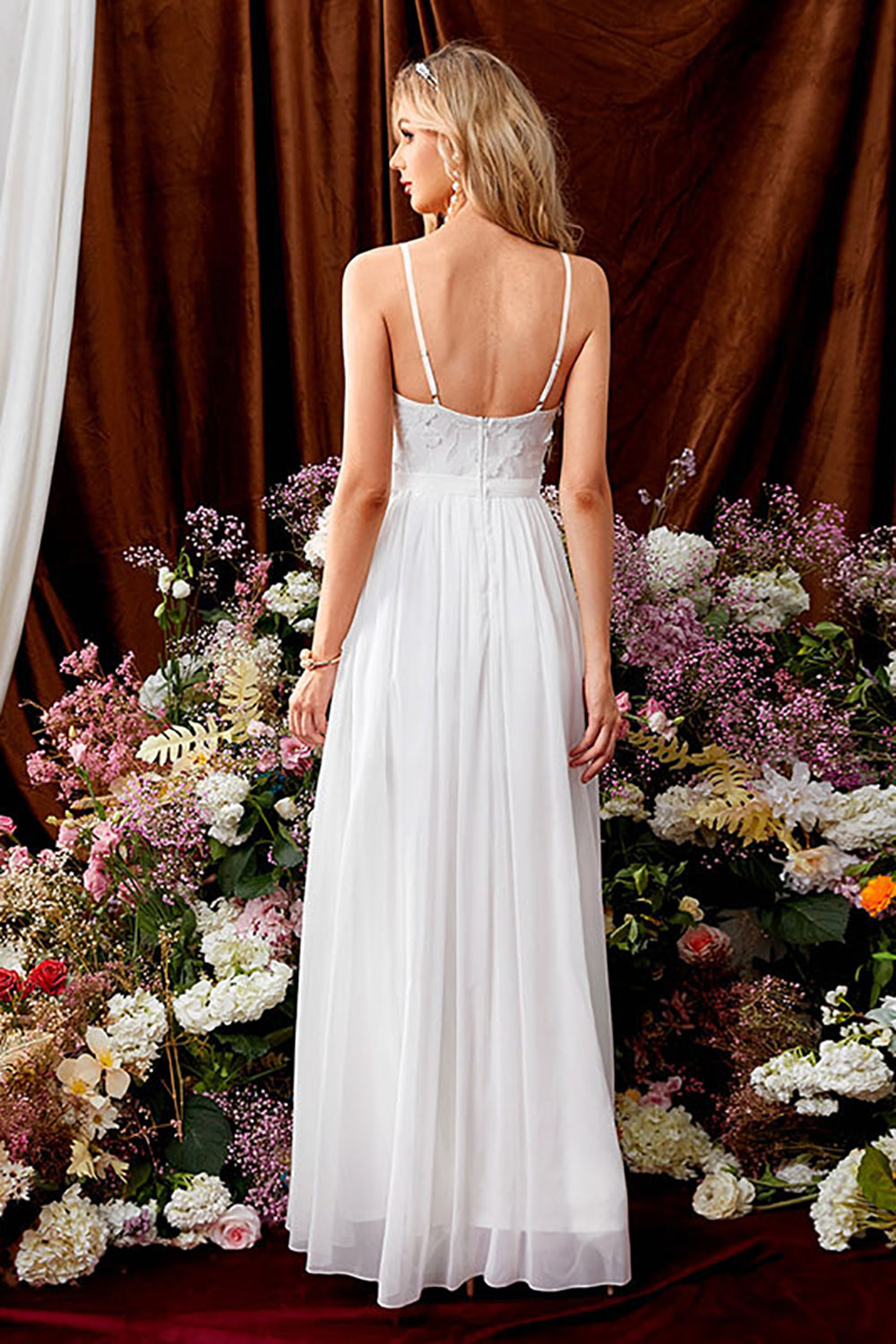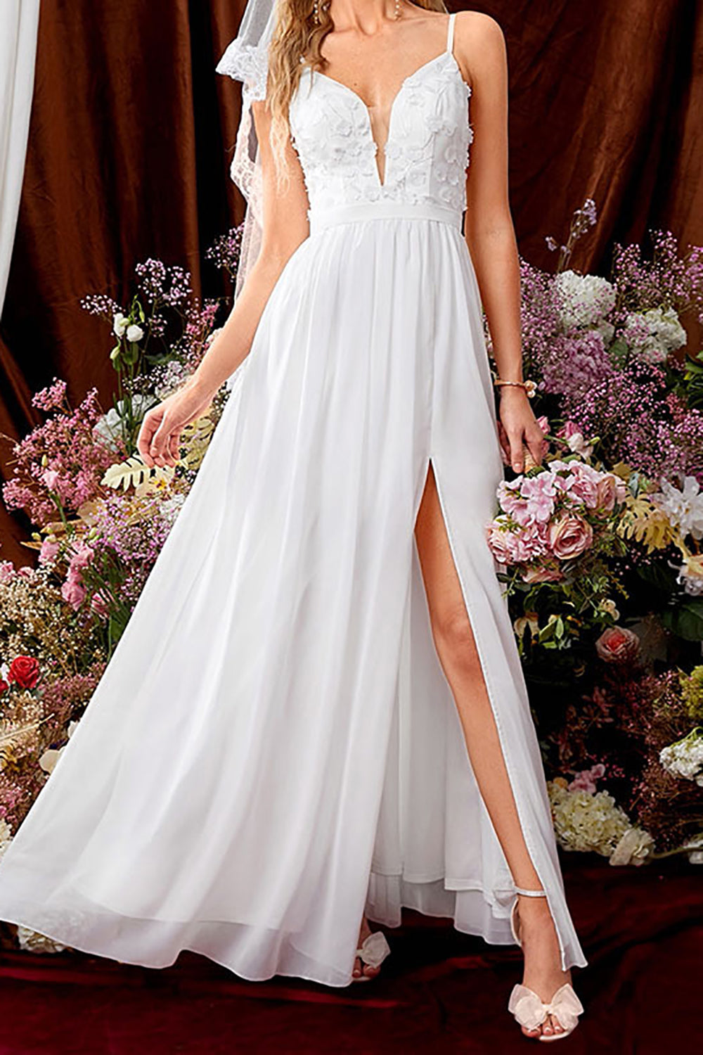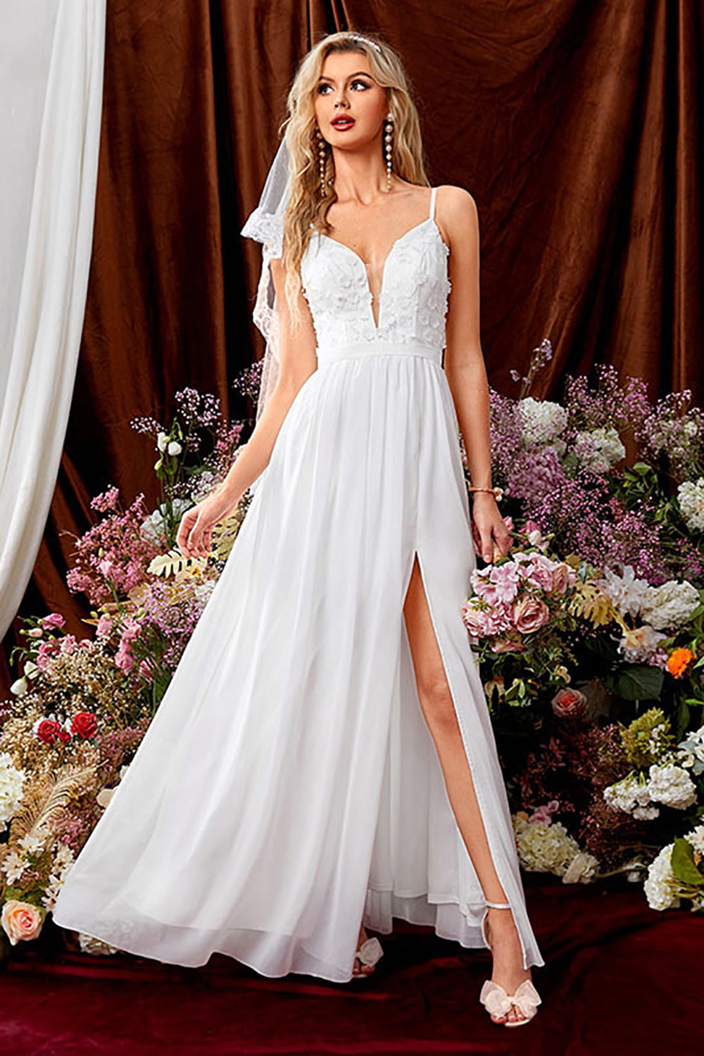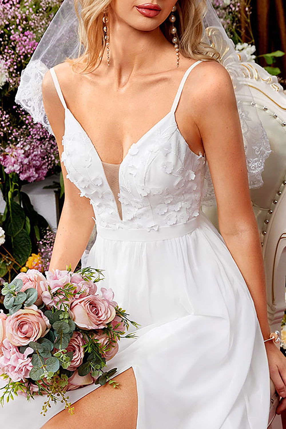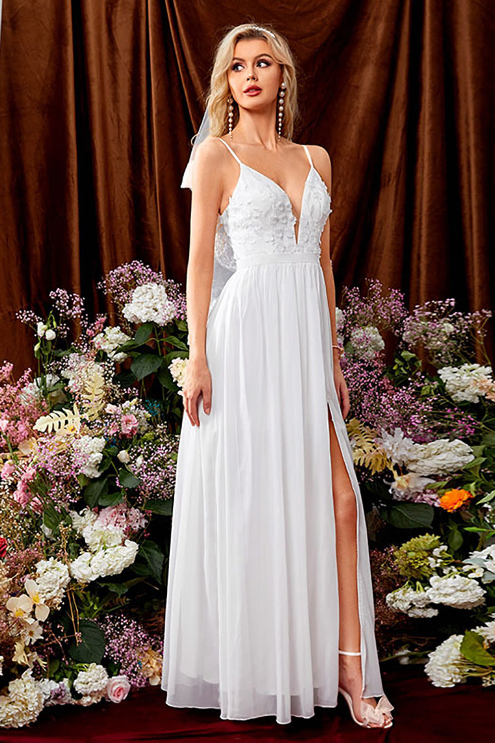 White A Line Spaghetti Straps Appliques Wedding Dresses With Slit