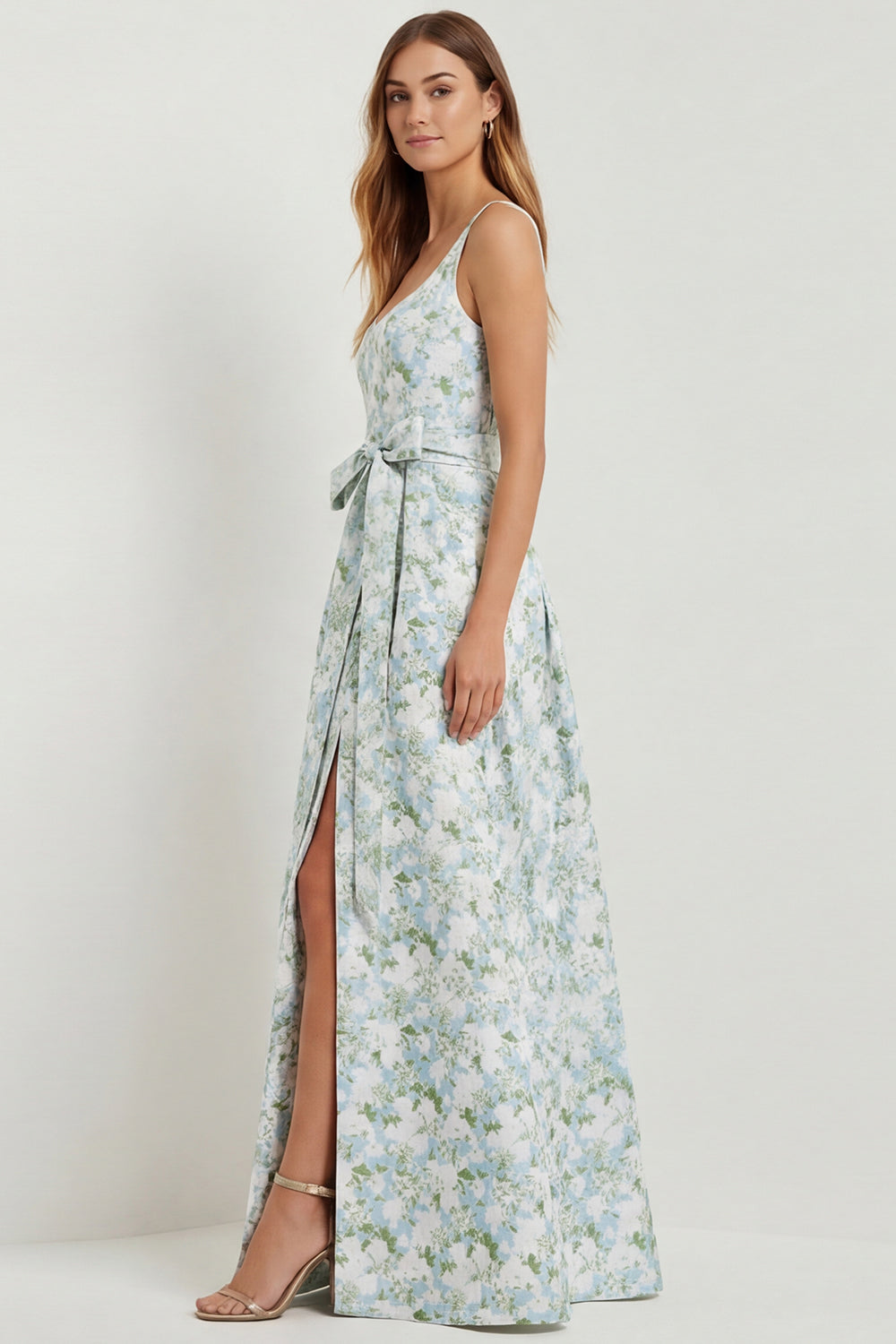 Blue White Flower A-Line Print Bowed Long Satin Wedding Guest Dress with Slit