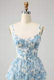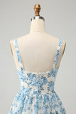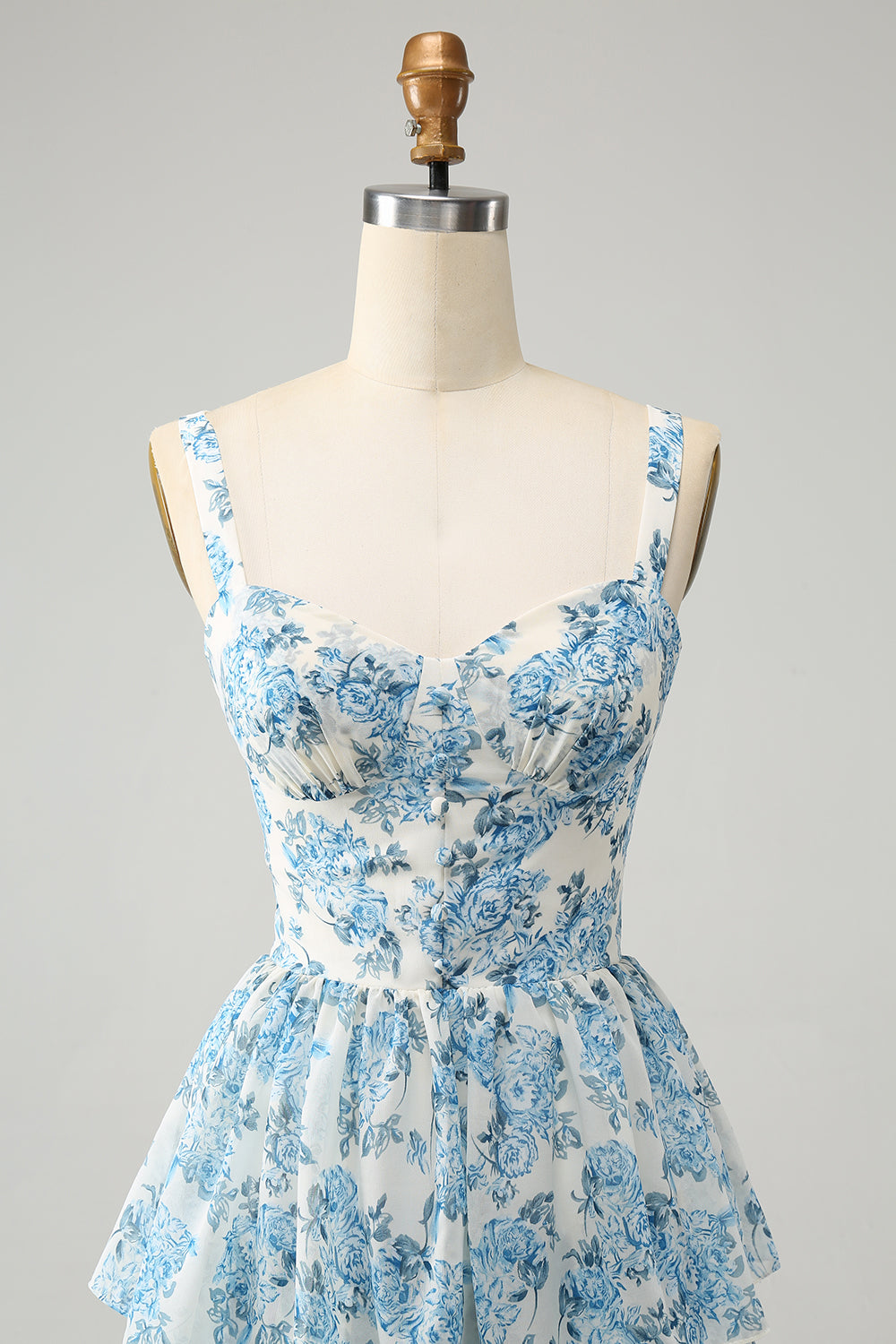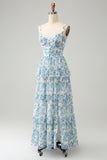 White Blue Flower A Line Spaghetti Straps Print Tiered Long Bridesmaid Dress