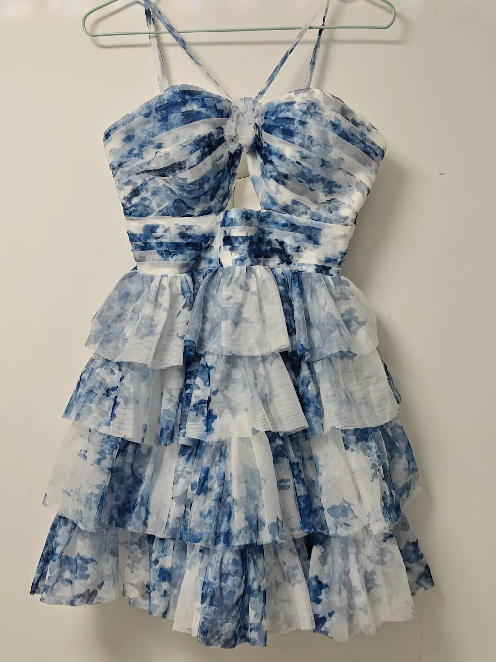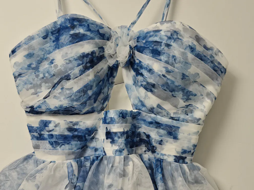 White Blue Flower A Line Halter Printed Tiered Homecoming Dress