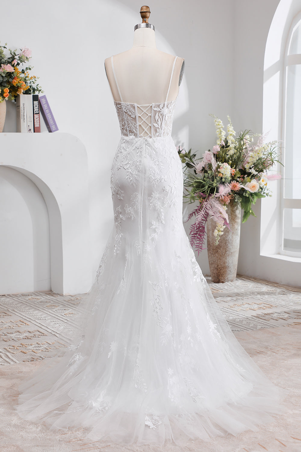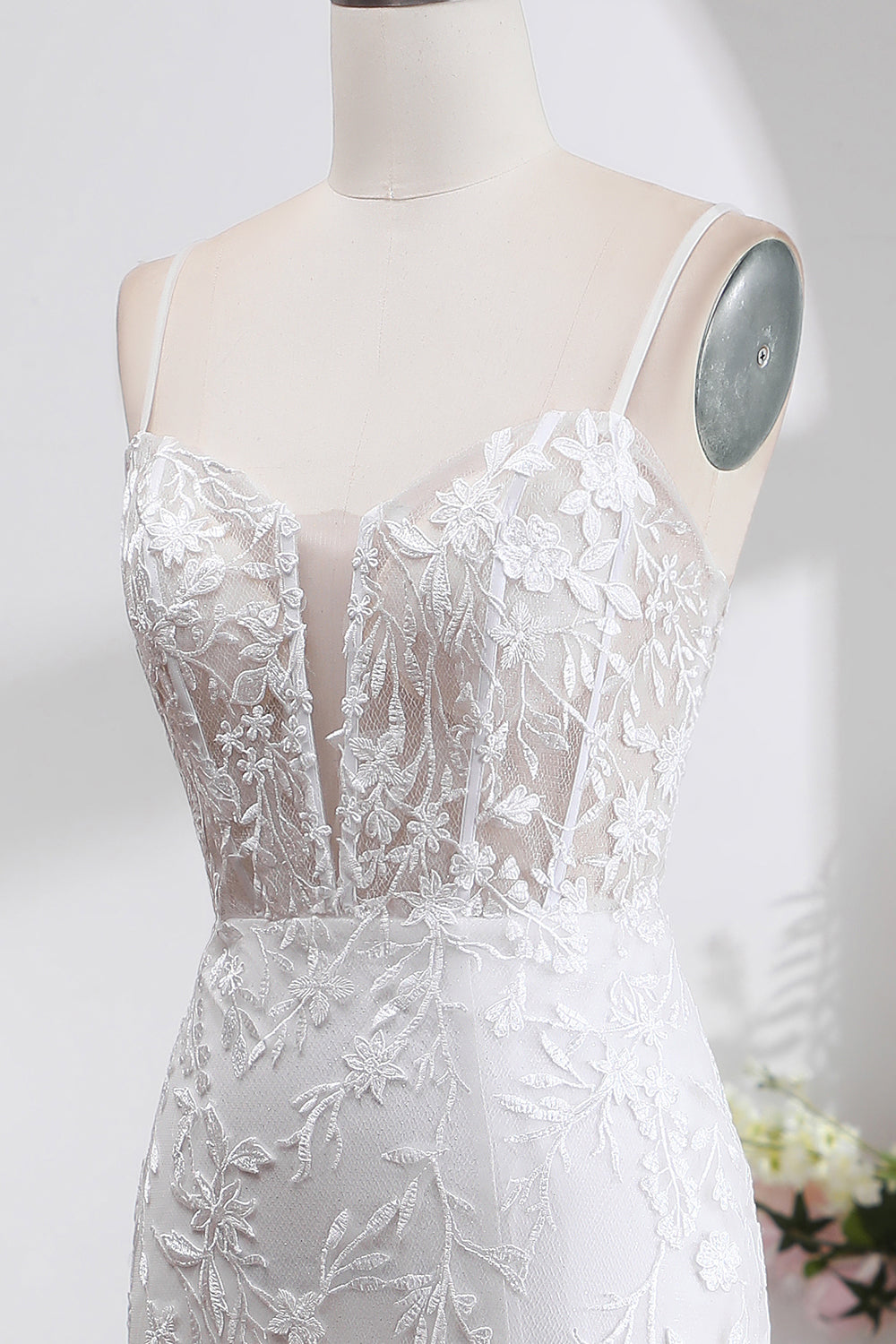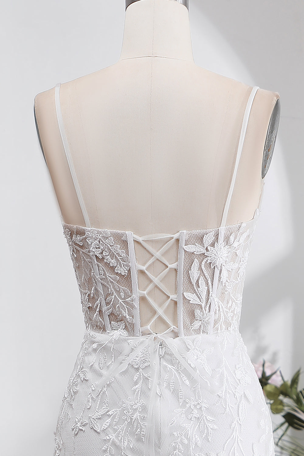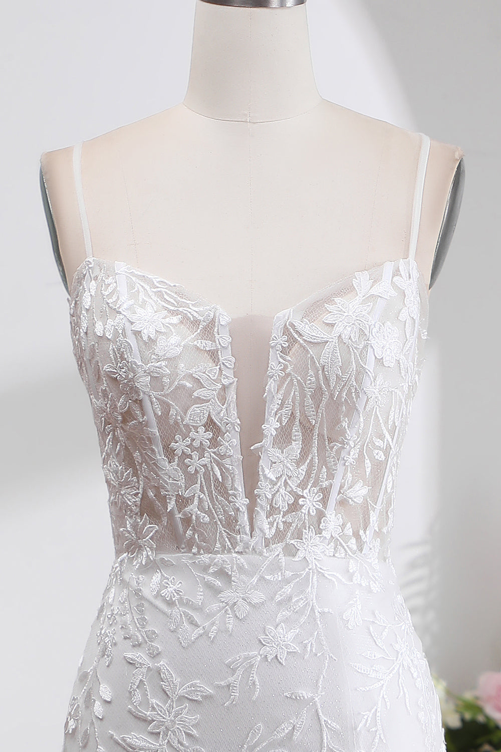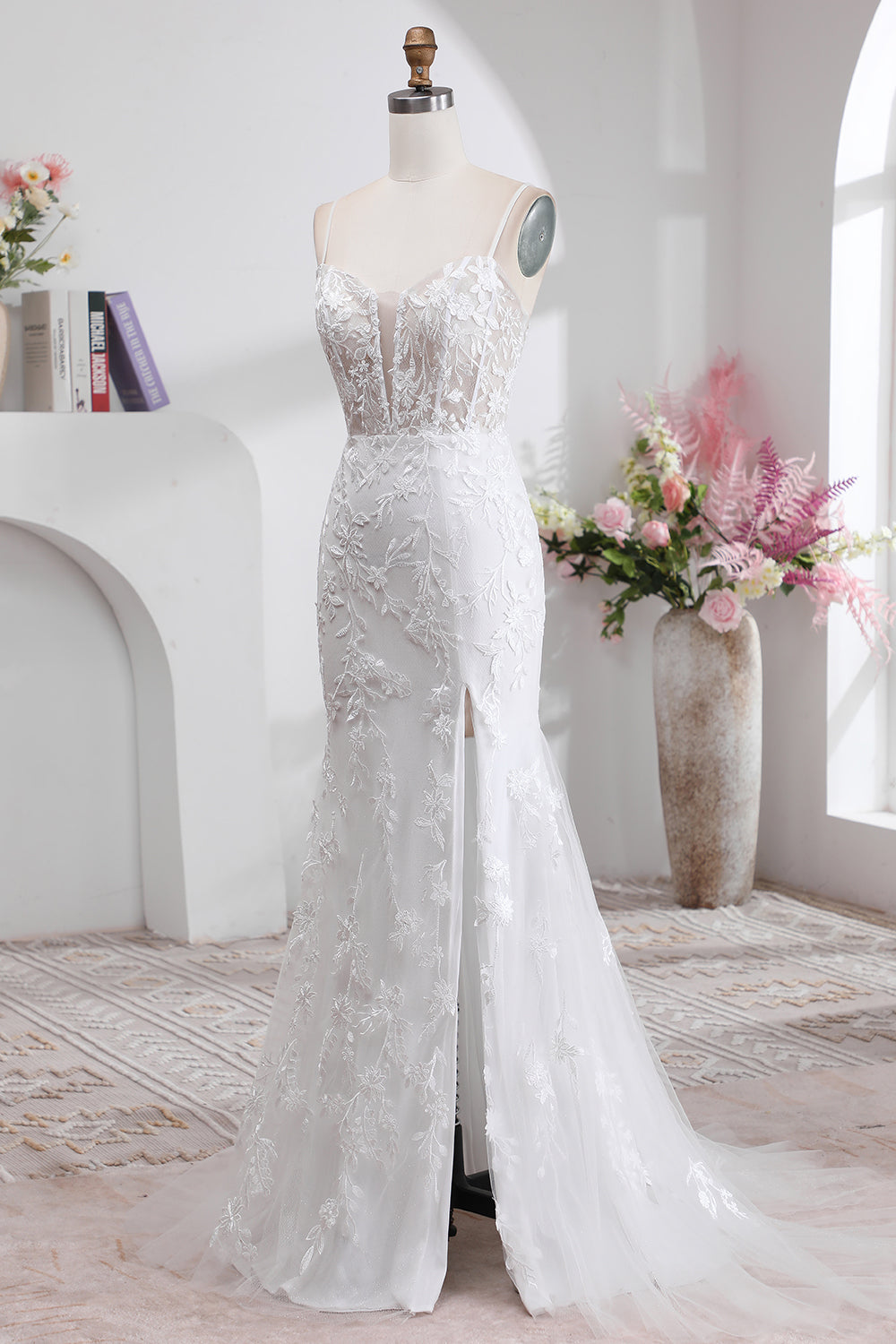 White Mermaid Spaghetti Straps Split Front Wedding Dress With Appliques